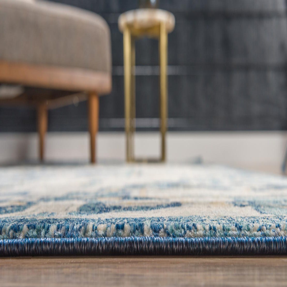 Primary color is Beige. Colors in this rug include: Beige, Blue, Navy Blue, Tan.