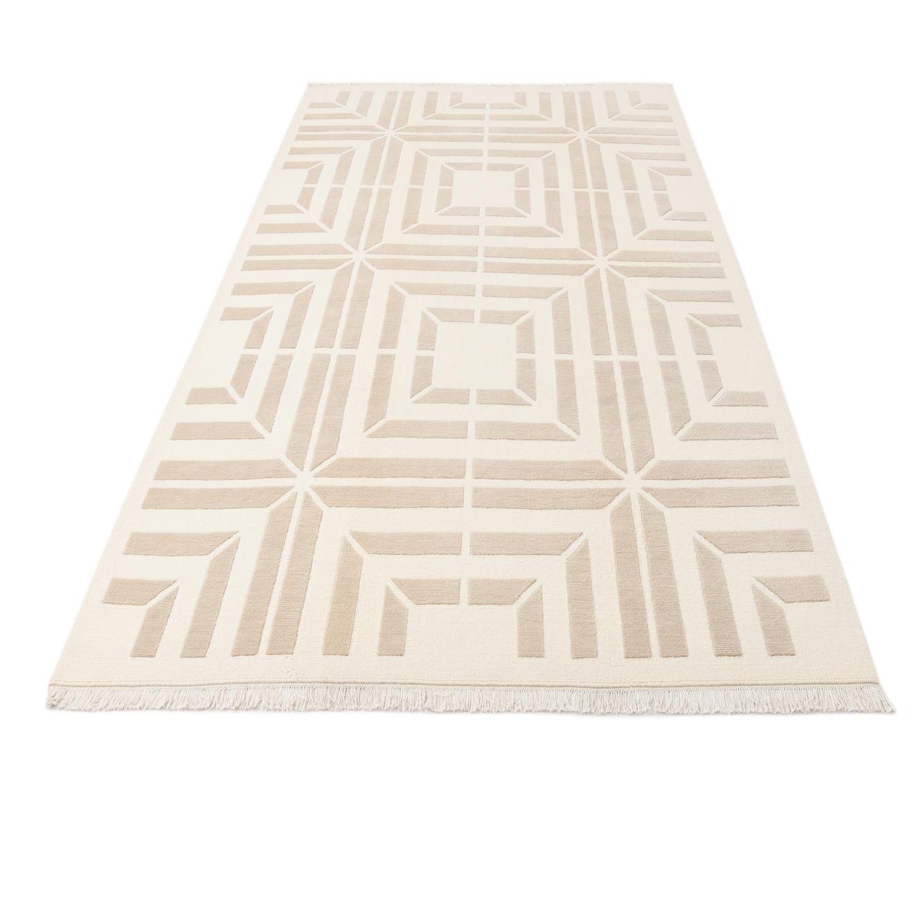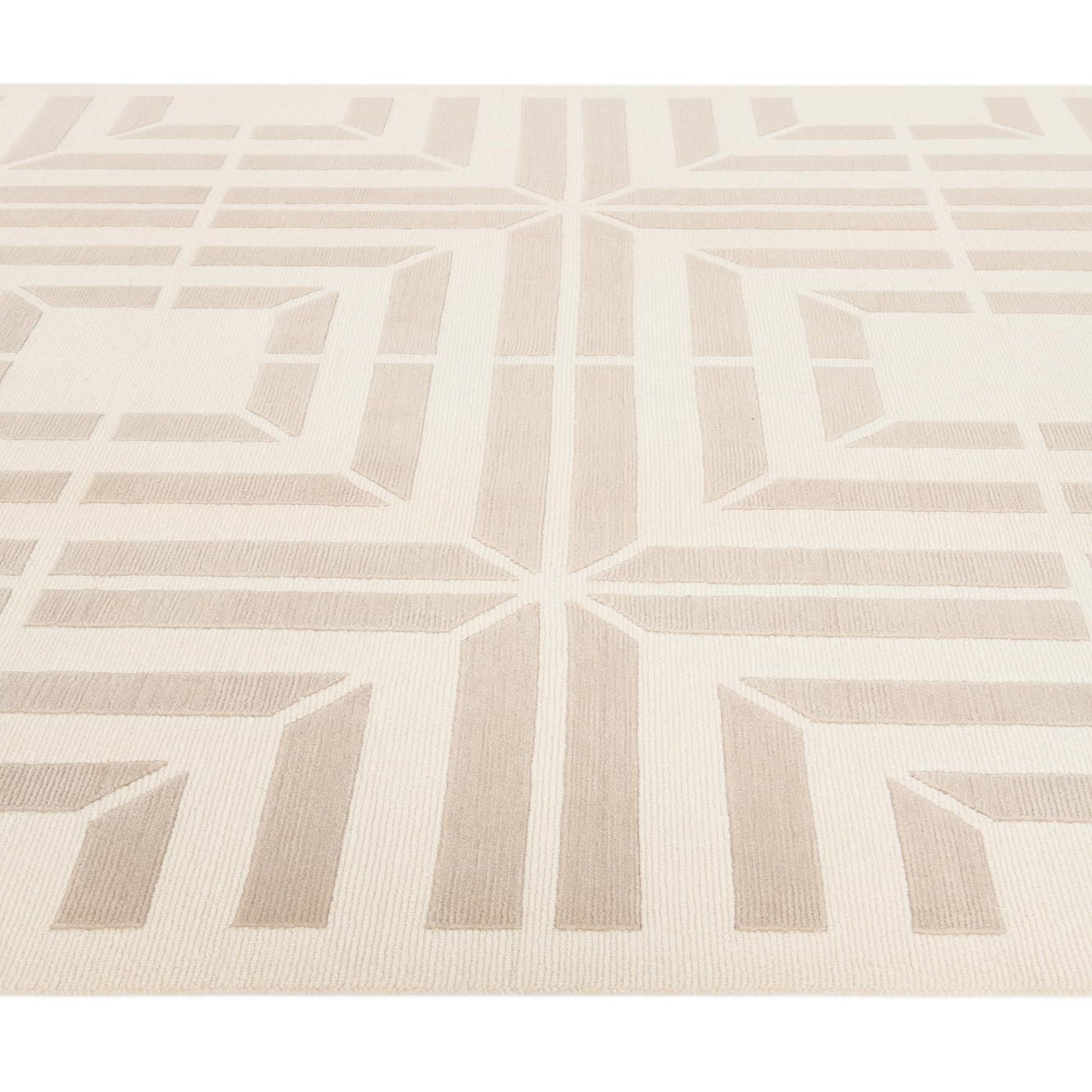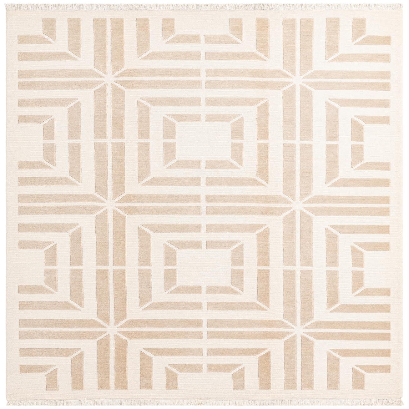 The rug's neutral tones of beige and tan ensure it can integrate seamlessly into a variety of interior design scenarios. This piece would work exceptionally well in contemporary settings where its geometric precision can complement minimalist furnishings or act as a grounding element in a more eclectic space. Its clean lines and unassuming color palette also make it a suitable choice for professional environments or areas where a touch of understated elegance is desired.