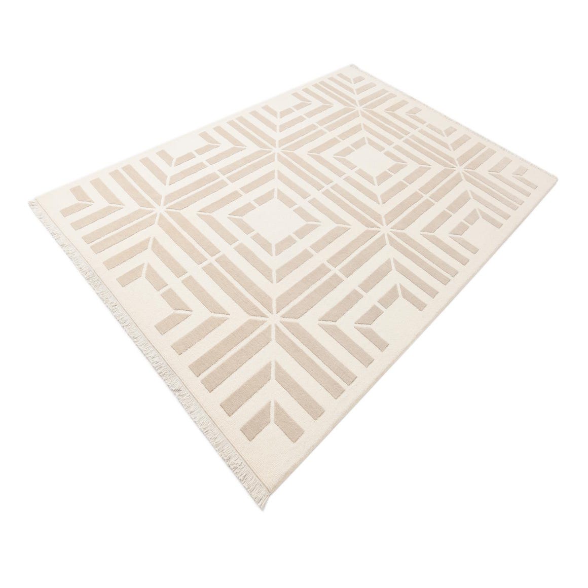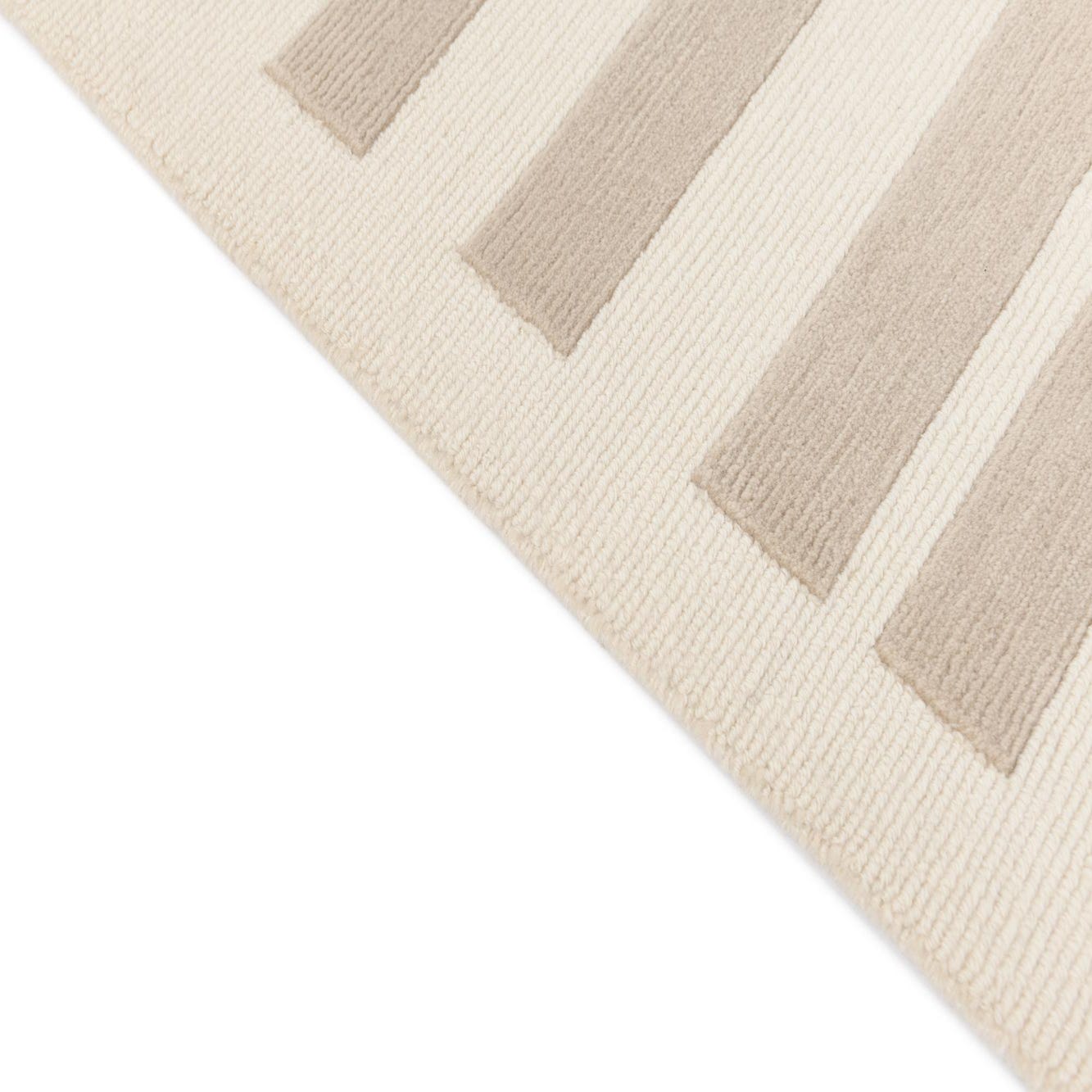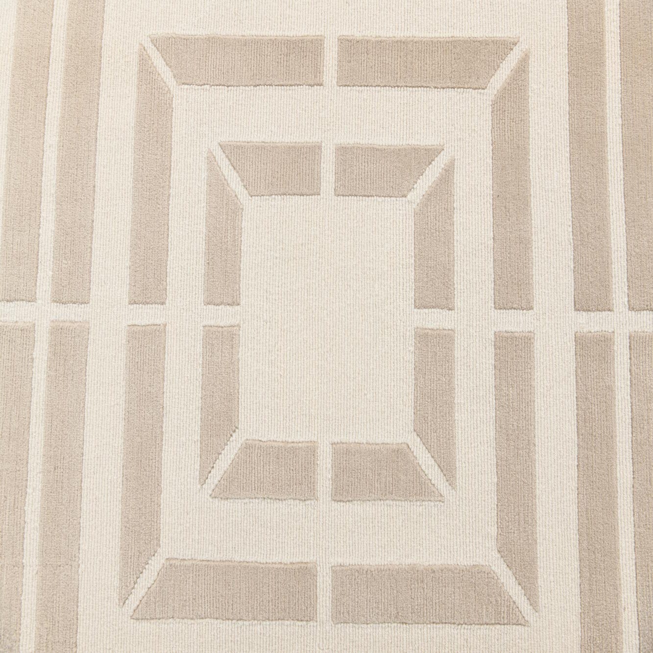 The rug's neutral tones of beige and tan ensure it can integrate seamlessly into a variety of interior design scenarios. This piece would work exceptionally well in contemporary settings where its geometric precision can complement minimalist furnishings or act as a grounding element in a more eclectic space. Its clean lines and unassuming color palette also make it a suitable choice for professional environments or areas where a touch of understated elegance is desired.