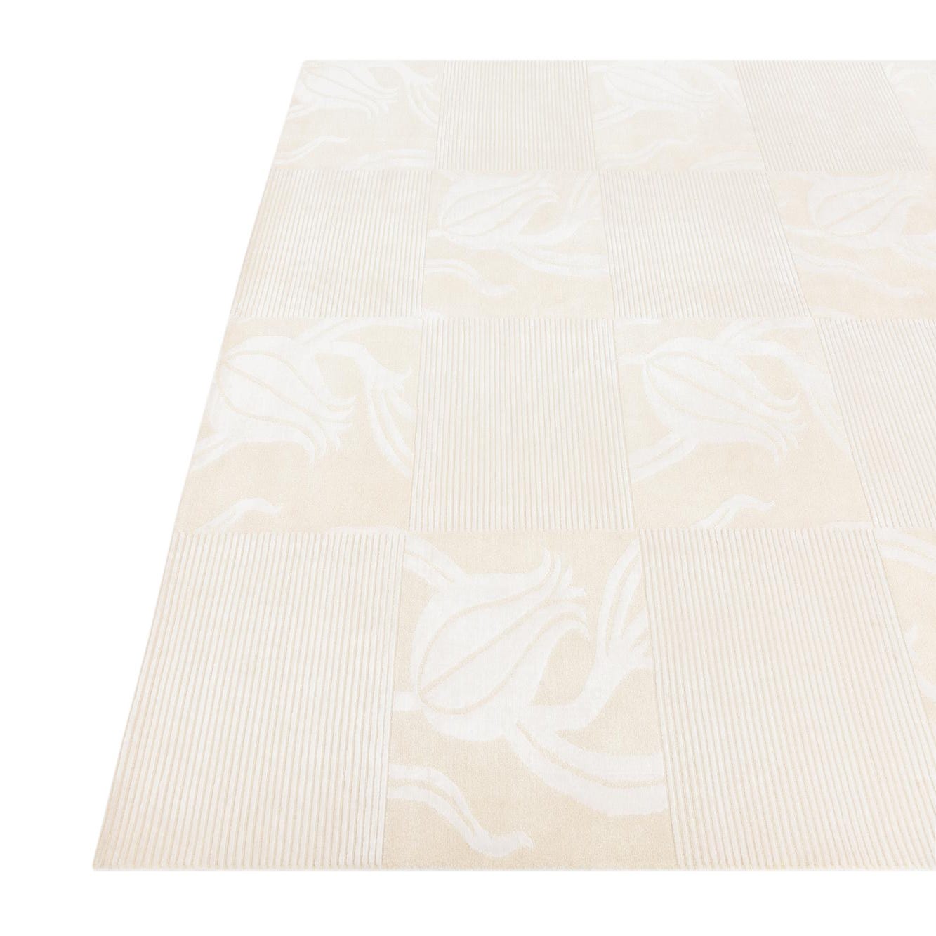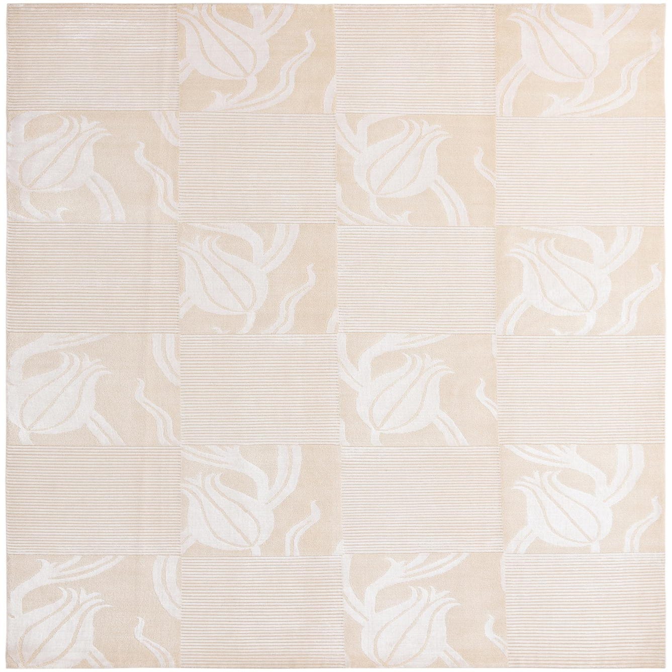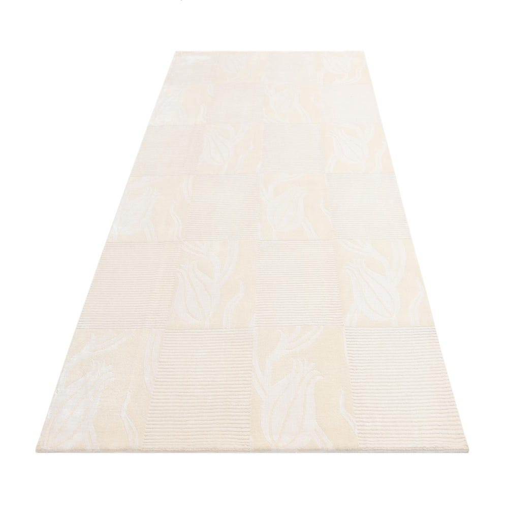 The Darya collection presents a refined 7x10 hand-knotted rug crafted from 100% wool, offering both durability and a soft, subtle texture. This rug features a sophisticated beige background elegantly juxtaposed with ivory accents. A contemporary take on botanical themes, the pattern shows stylized floral motifs arranged in a harmonious grid, creating an inviting and serene atmosphere. The parallel lines incorporated in some blocks introduce a sense of structure and textural interest.