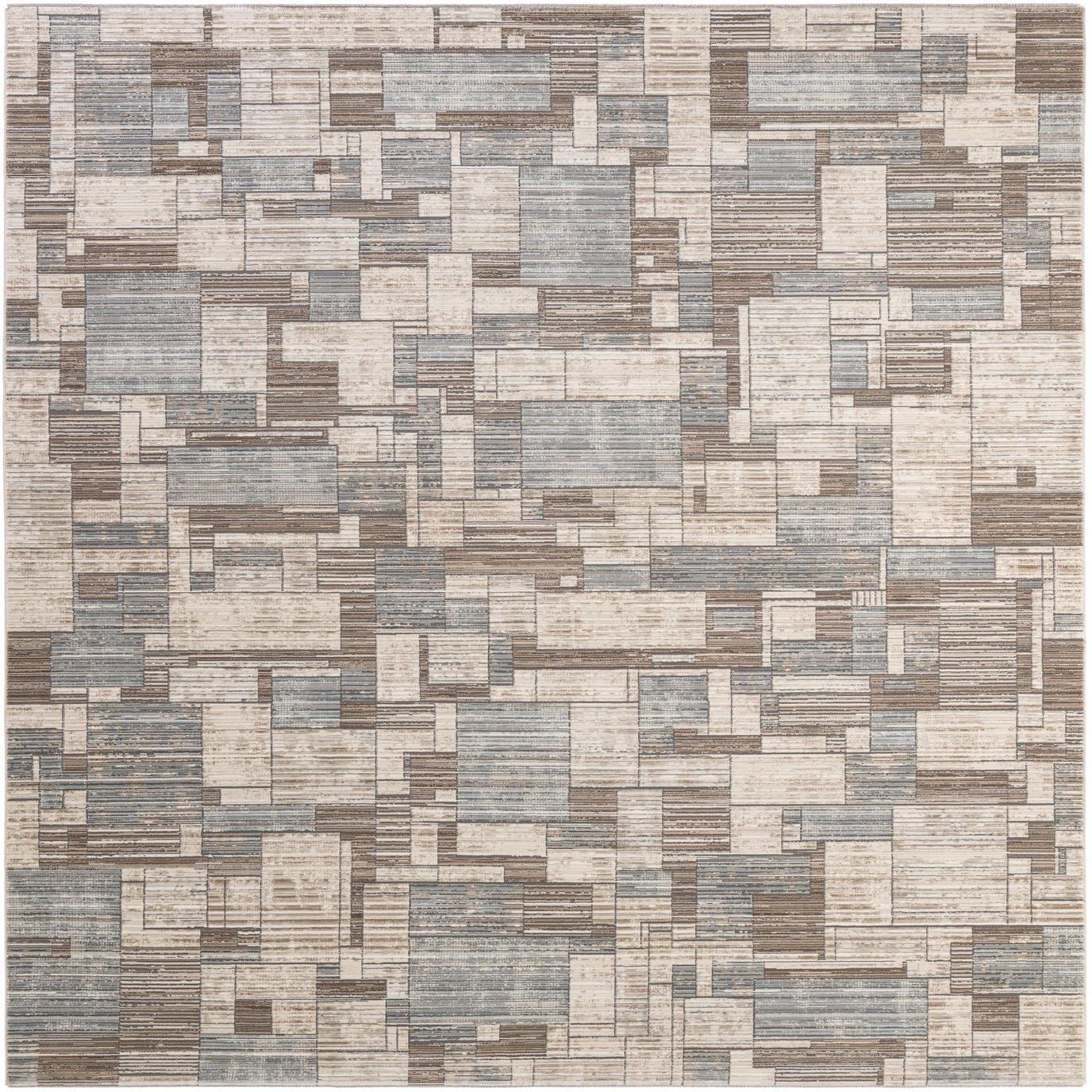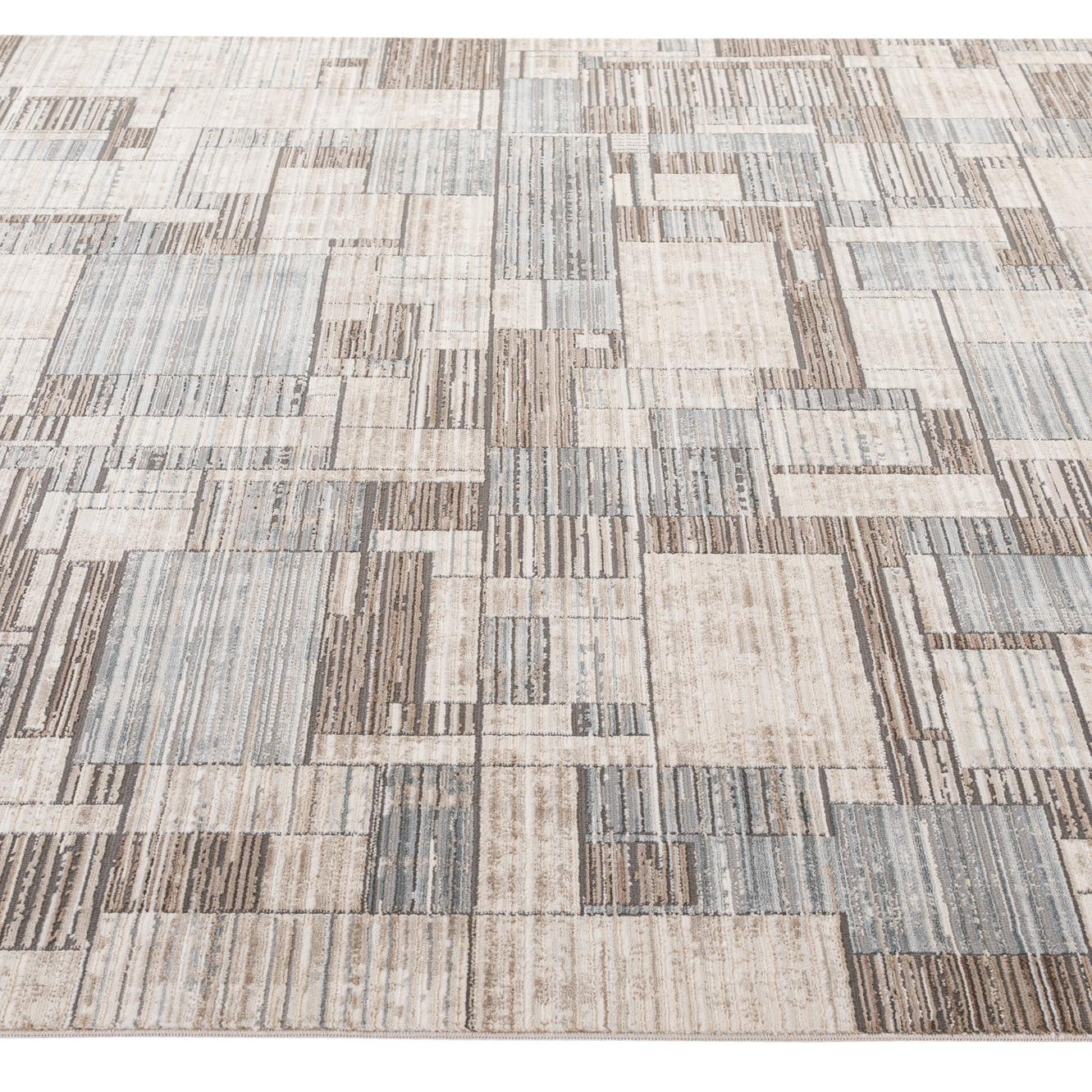 A 7x10 rectangular modern area rug featuring a geometric pattern in shades of brown, tan, cream, and light blue.