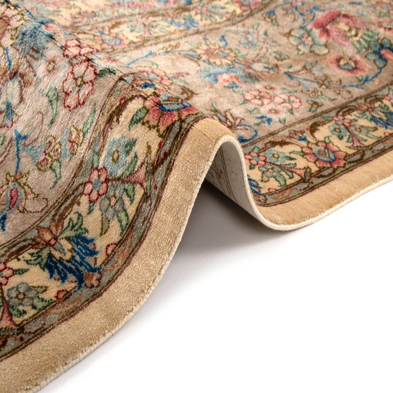 Crafted entirely from silk, the texture offers both a subtle sheen and a remarkably soft touch underfoot. The color palette is a tasteful blend that includes hues of blue, beige, brown, light blue, pink, and red, which come together to form a versatile and inviting floor covering. The borders are meticulously detailed, echoing the richness of the central design and providing a balanced frame to the piece.