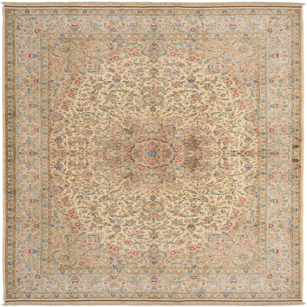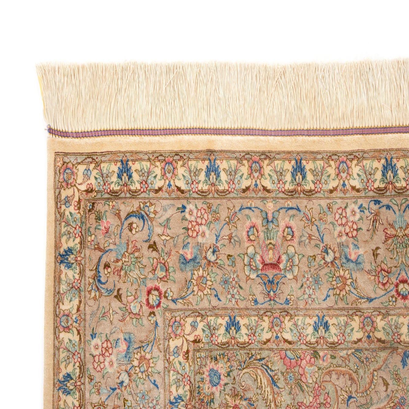 The Ghom Silk collection presents a handcrafted 7x10 rug that showcases a sophisticated amalgamation of traditional design with a modern sensibility. The rug features a detailed pattern with an intricate array of floral and foliage motifs, beautifully distributed across the surface. A central medallion serves as a focal point, surrounded by a harmonious pattern that spans the entire beige background.