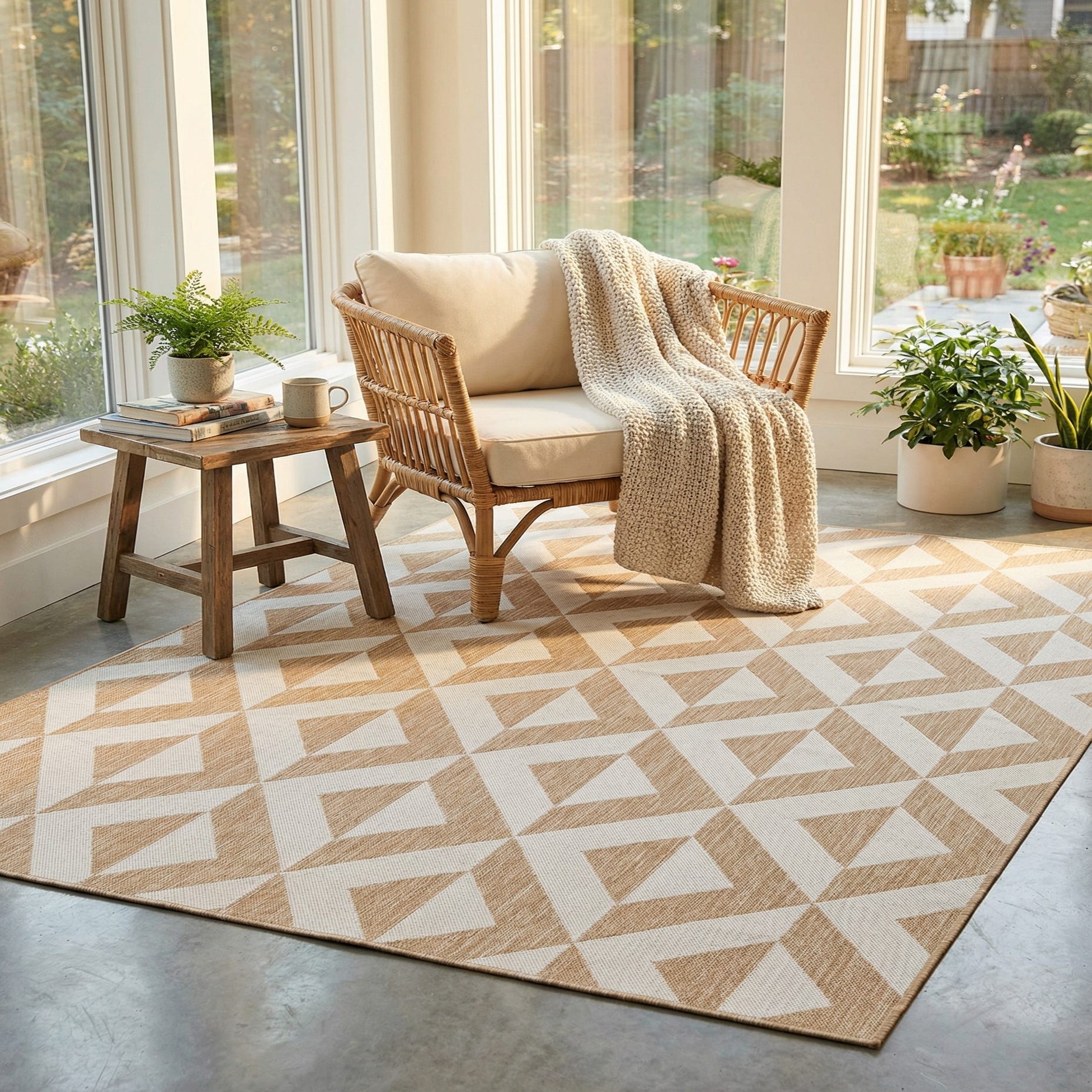 This rug fits easily into outdoor living areas like a covered patio or sunroom, and also works well inside in high-traffic rooms such as an entryway or dining area where a durable, low-pile surface is needed. Pair it with natural wood or rattan furniture, cream or navy cushions, and simple metallic accents for a contemporary coastal or mid-century-inspired scheme. The neutral beige and brown palette makes it a versatile anchoring piece for layered rugs, wood floors, or woven decking.