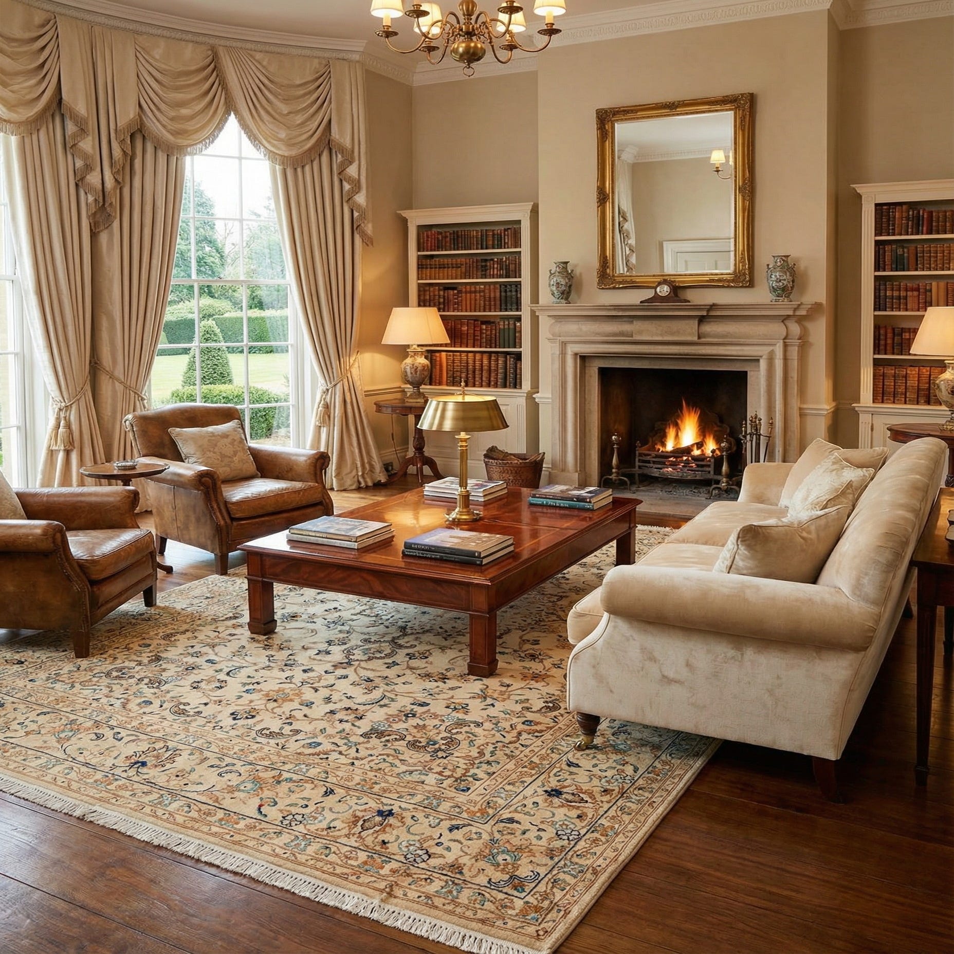 This rug's classic design and neutral color palette make it ideal for a range of interior scenarios, from formal dining rooms and living areas to more intimate spaces such as bedrooms or studies. Its traditional aesthetic pairs well with antique furniture and wood finishes, enhancing the sophistication of a space. Alternatively, the rug can serve as a refined anchor for a transitional decor, bridging the gap between modern minimalism and classic opulence.