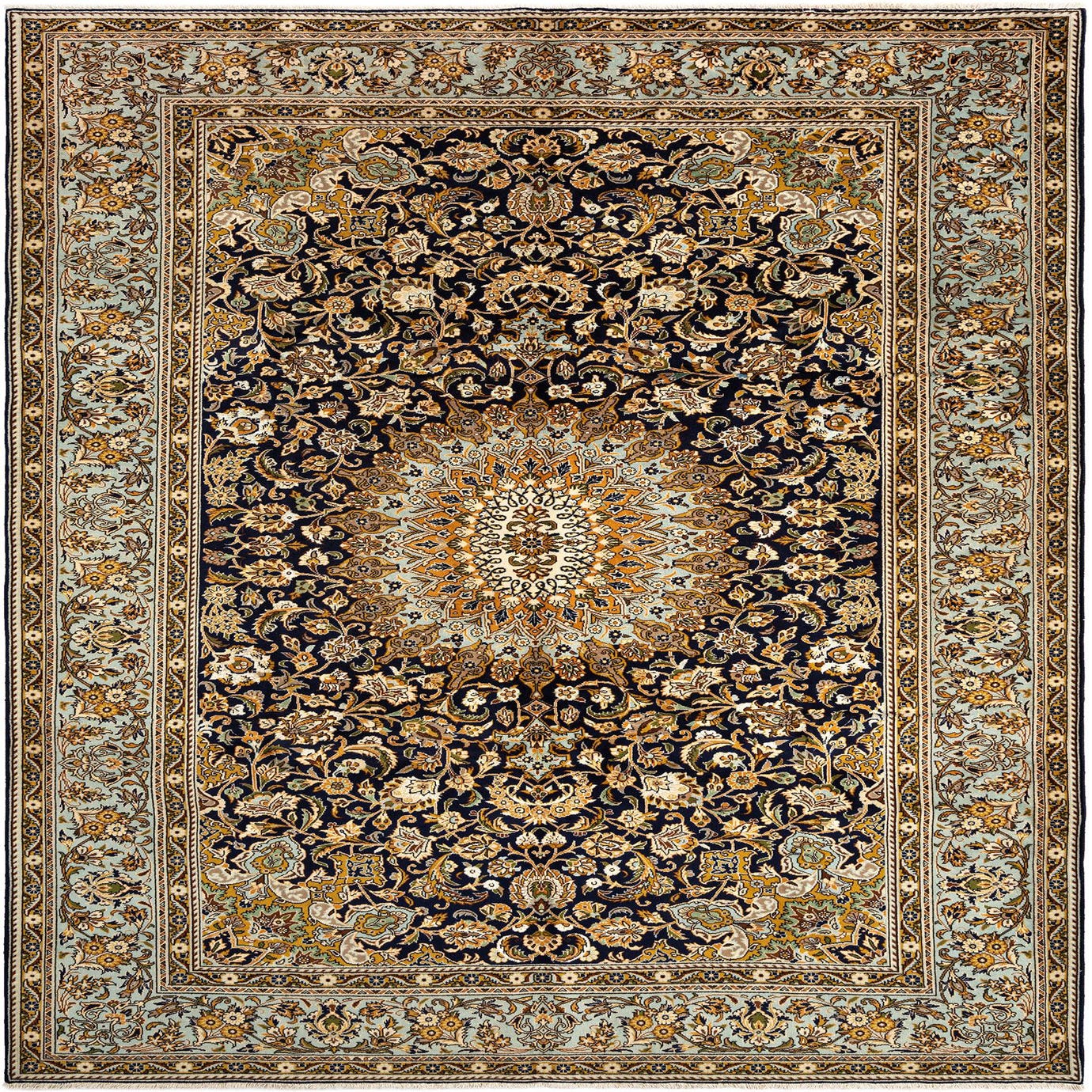 A rectangular 7x10 Kashan Persian rug with a central medallion, intricate floral patterns, and a light blue border on a dark blue background.