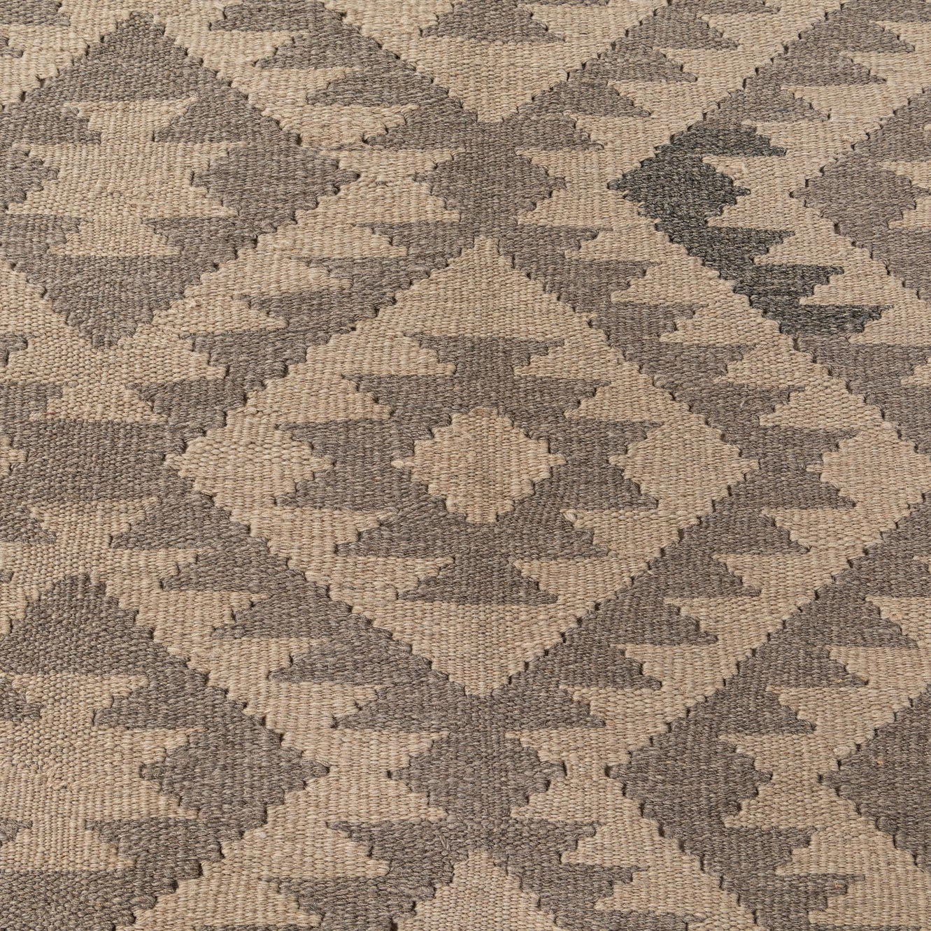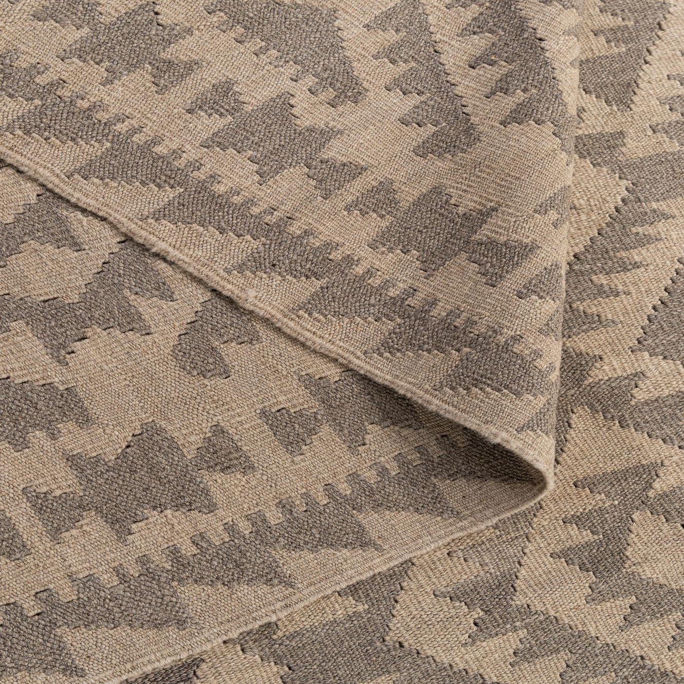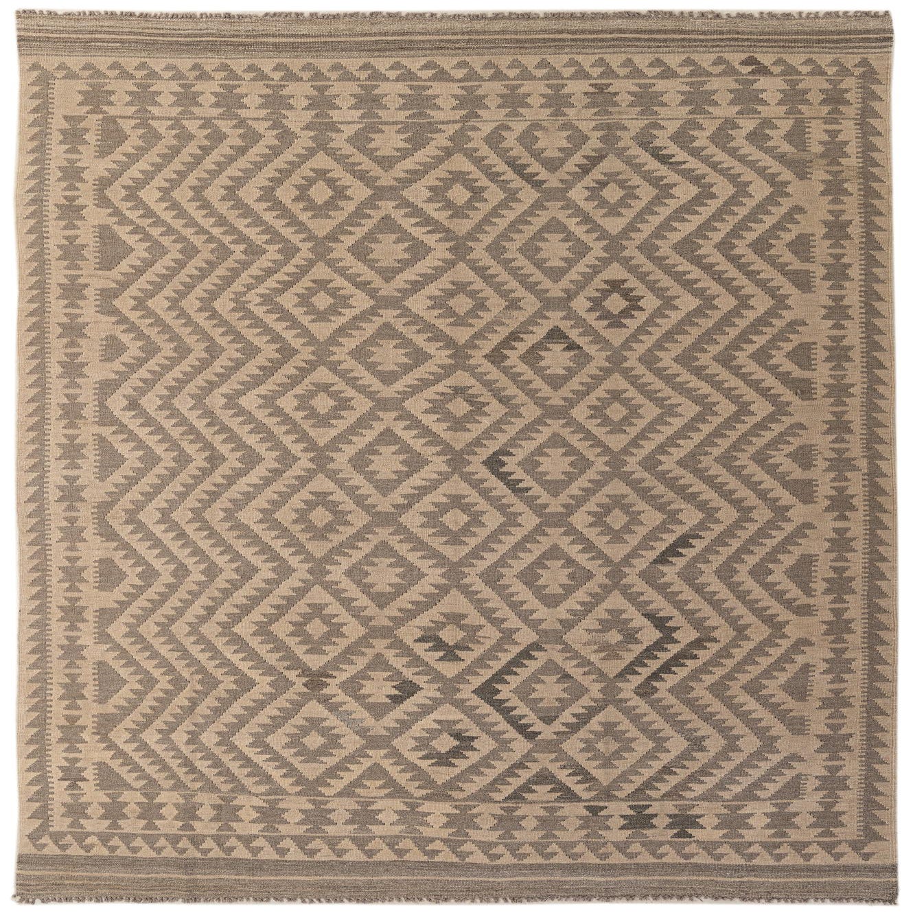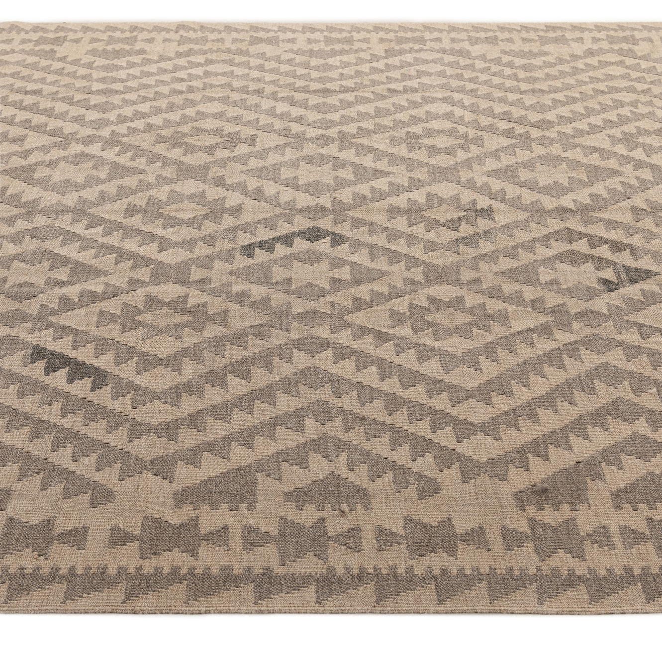 A 7x10 rectangular flatweave Kilim Maymana rug featuring a tribal diamond pattern in shades of brown, tan, and cream.