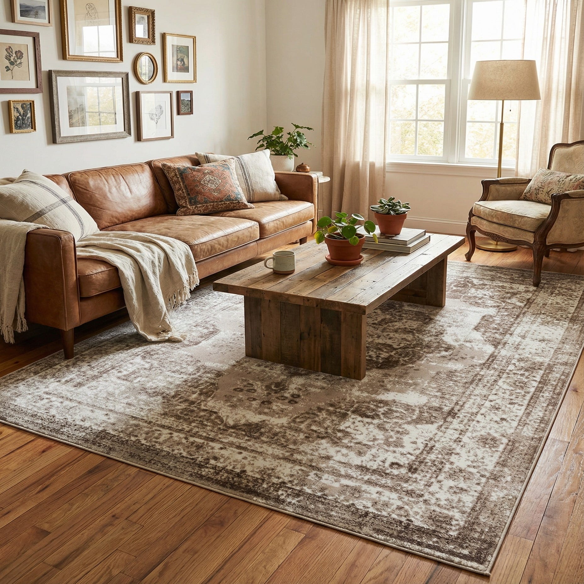 A vintage-inspired medallion pattern is softened by a distressed, worn-in finish that gives this rug a relaxed, lived-in look. A beige ground provides the backdrop for an oversized central medallion and layered border motifs rendered in warm brown and creamy ivory. The pattern has been intentionally faded in places to create gentle contrast and visual depth, while the overall design maintains a classic, transitional feel.