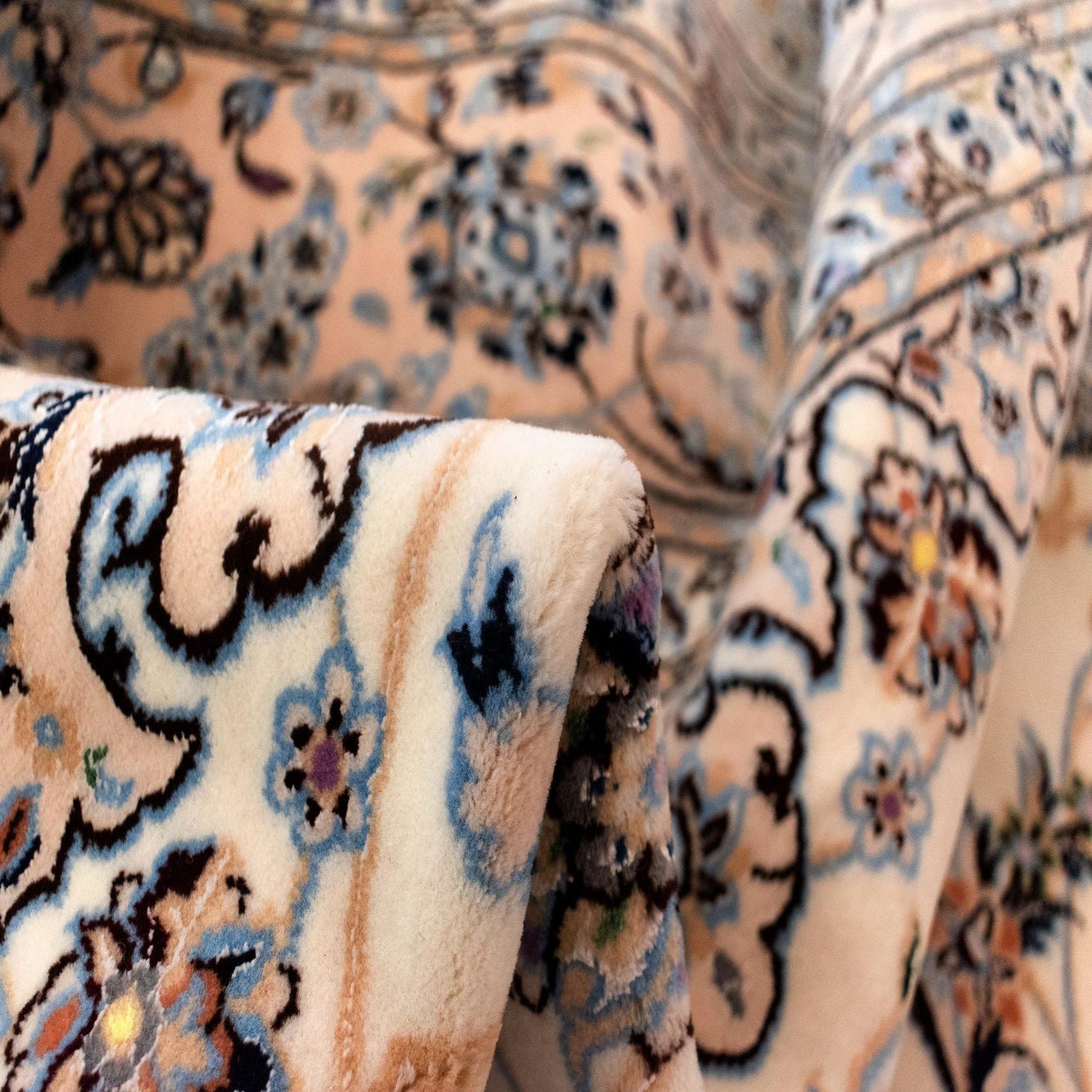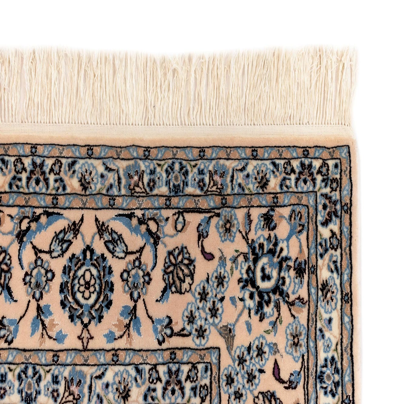 Hand made of 100% wool, the pile has a soft, slightly springy feel underfoot and a low-profile finish that layers well in busy rooms. The narrower fringe at each end and the tightly worked motifs read as refined and traditional while remaining adaptable. Place this rug beneath a living-room sofa group or under a dining table to anchor a formal setup, or use it in a bedroom to introduce pattern and warmth beneath the bed. It pairs particularly well with light-wood furniture, linen upholstery, and brass or matte-metal accents for a transitional look that leans classic without feeling dated.