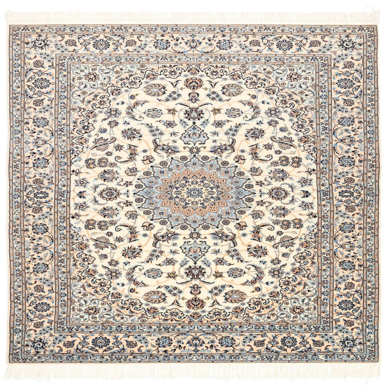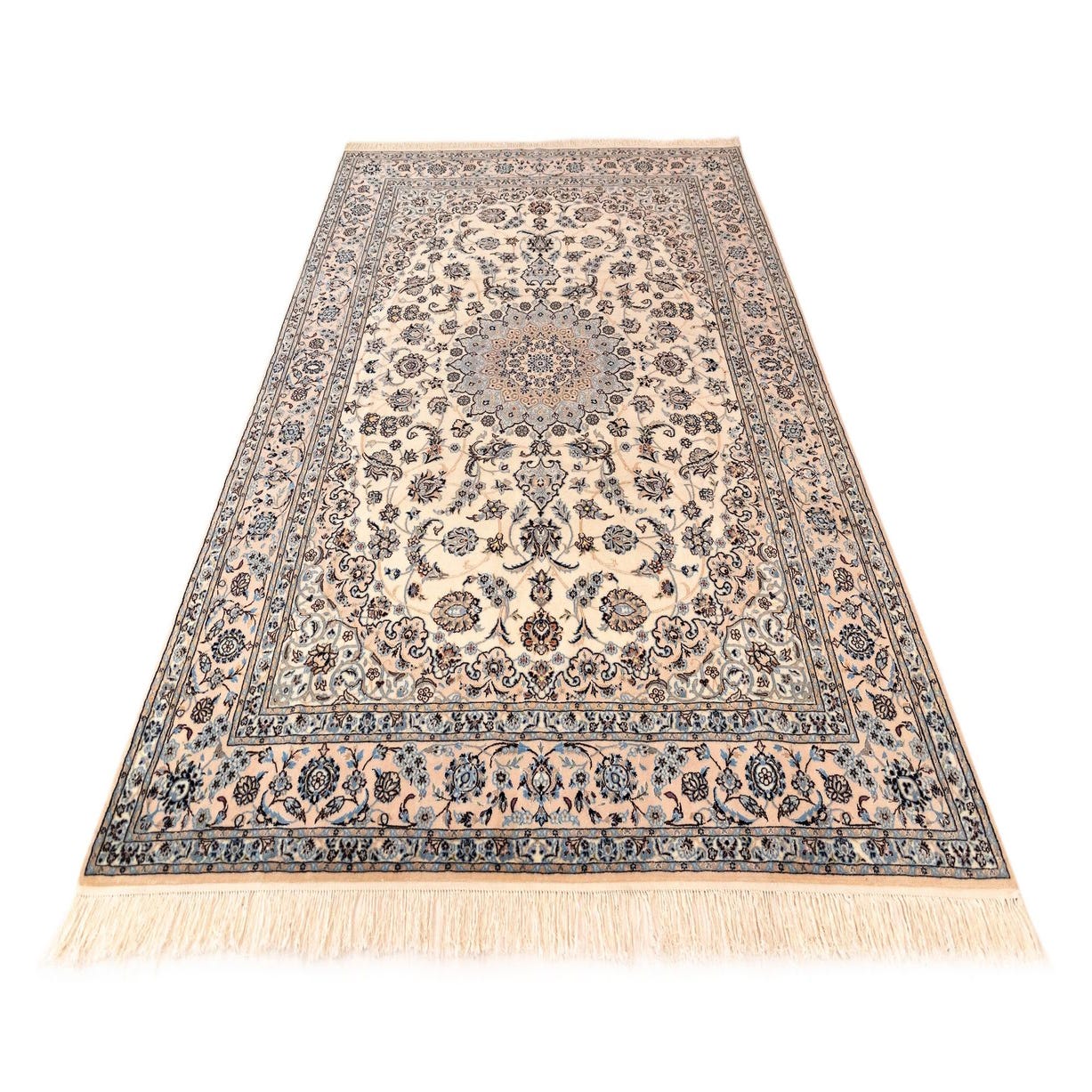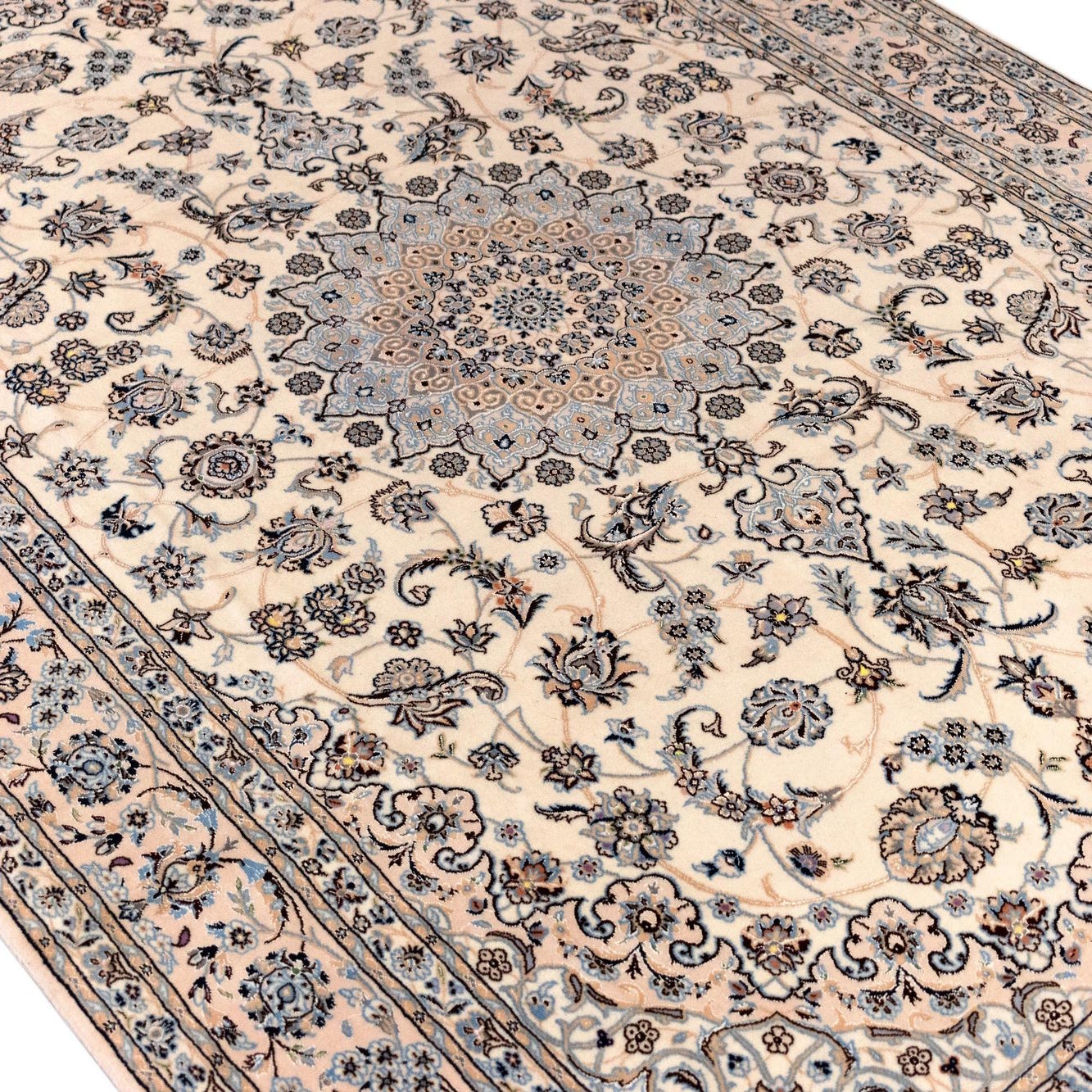 A 7x10 rectangular Persian rug with a central medallion and intricate floral patterns in ivory, cream, and brown.
