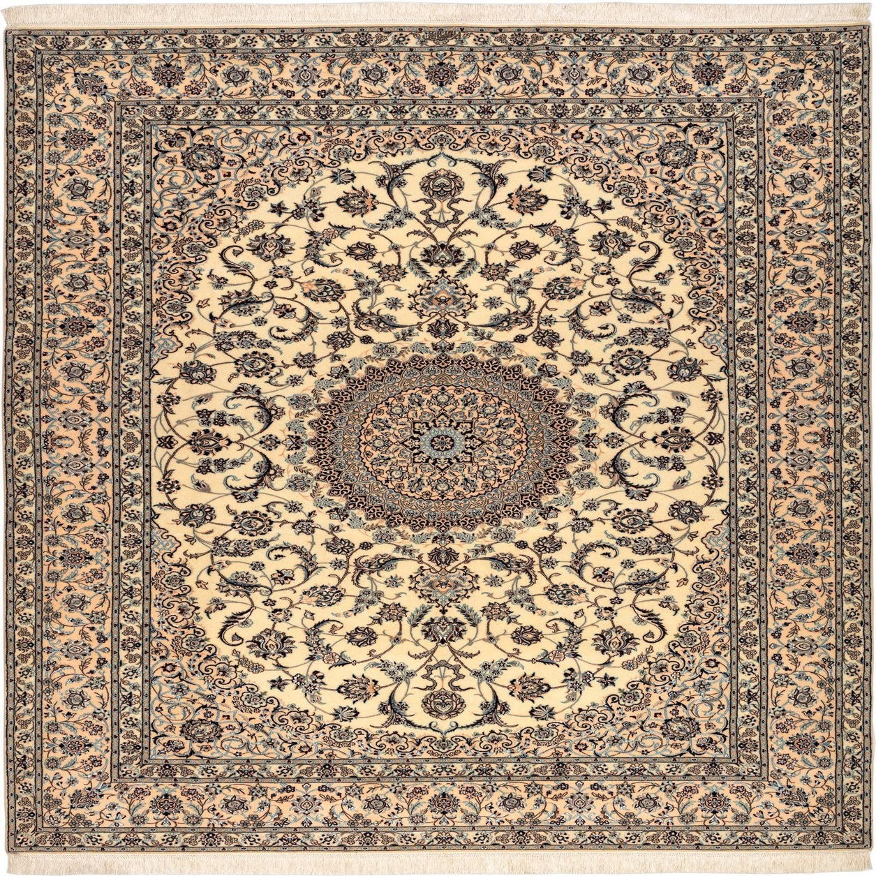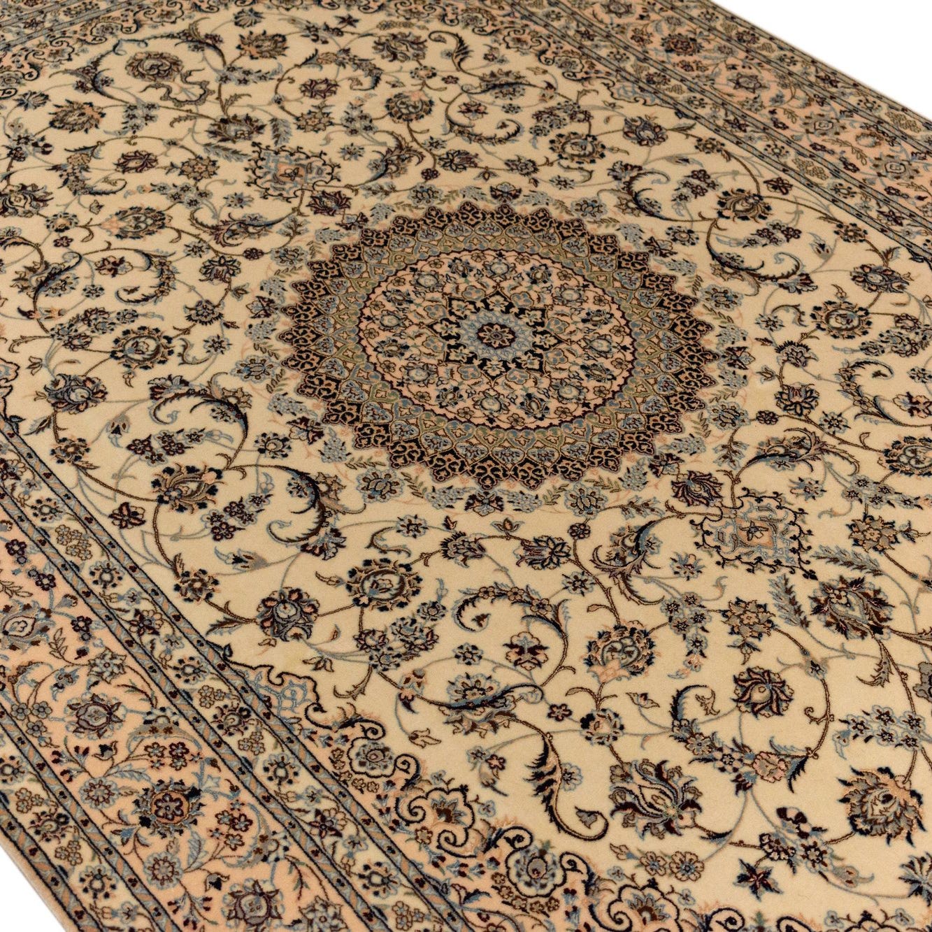 This Nain collection rug is a handcrafted masterpiece that combines the warmth of wool with the sheen of silk, resulting in a tactile experience that is as luxurious as it is durable. Measuring 7x10, the rug boasts a sophisticated beige background that is complemented by a rich palette of browns, carefully woven into an intricate traditional pattern. Its design features a medallion centerpiece encircled by detailed florals and arabesques, bordered by an equally elaborate frame.