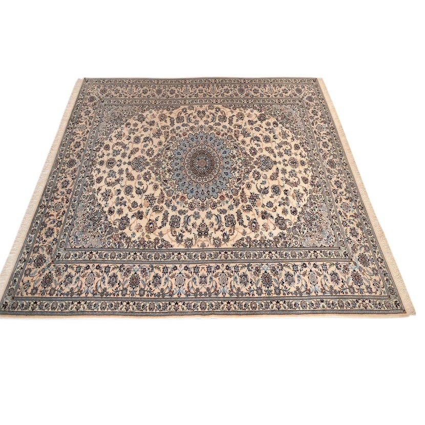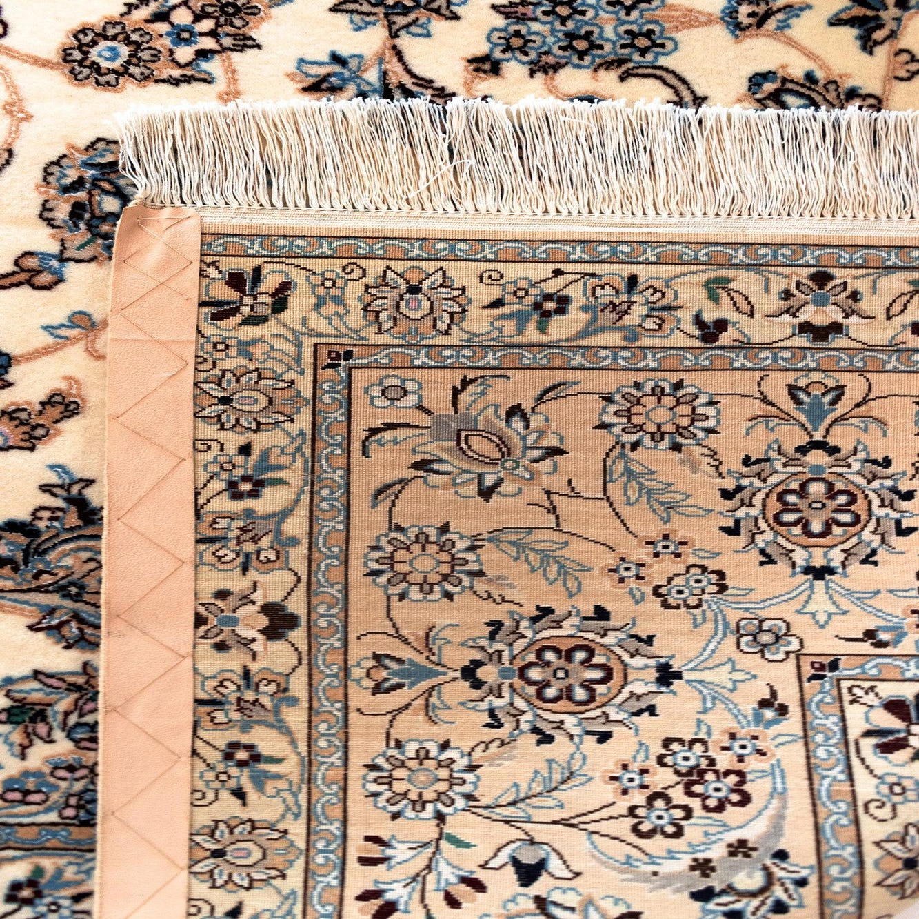 The Nain rug's traditional design and subdued color palette would complement a classic, refined interior. It would serve well in a formal living room, a stately dining area, or an executive office space, providing an anchor for a range of sophisticated furniture styles, from antique wood to brass or velvet textures. The quality wool and silk composition ensures both comfort underfoot and a visually appealing luster that enhances the rug's ornate pattern.