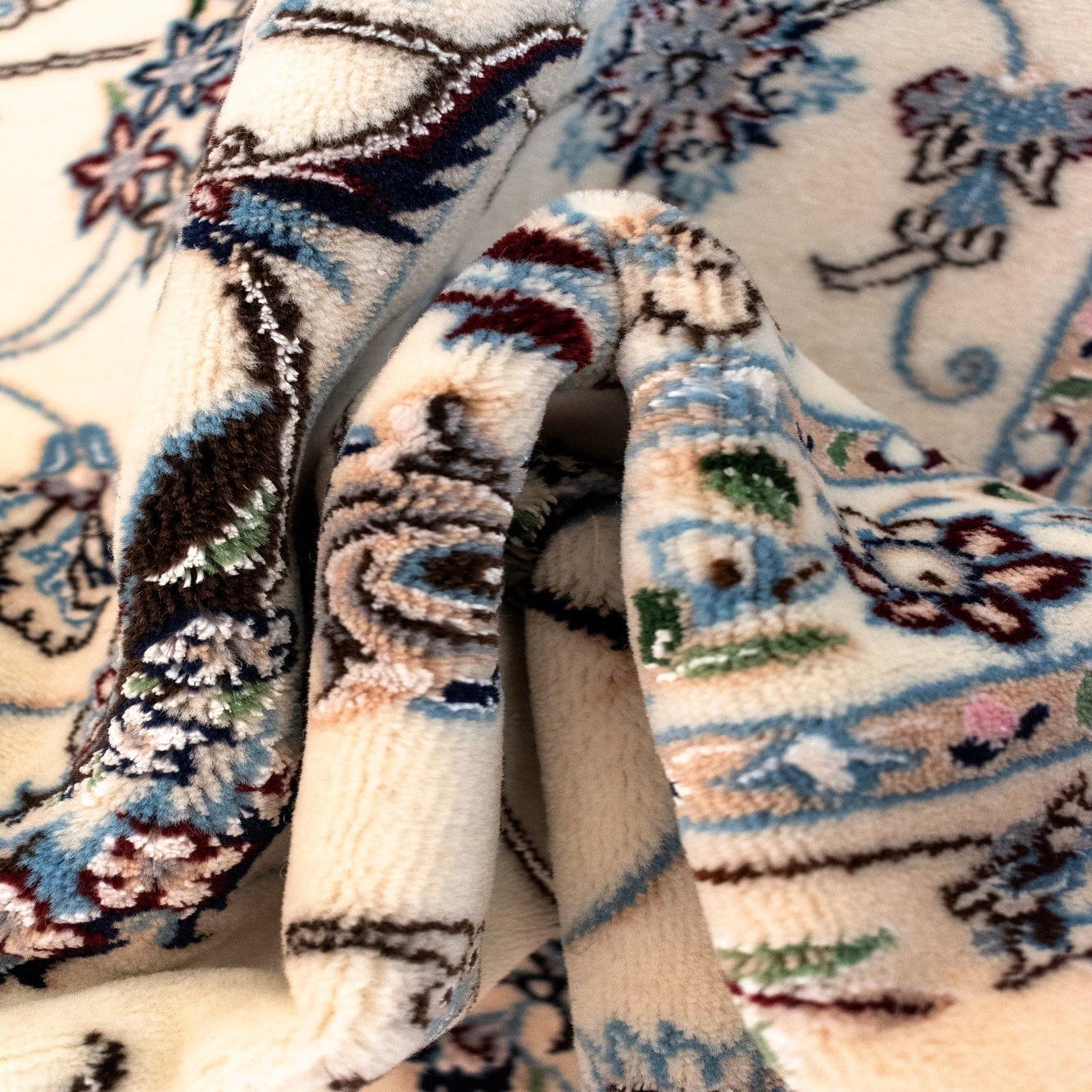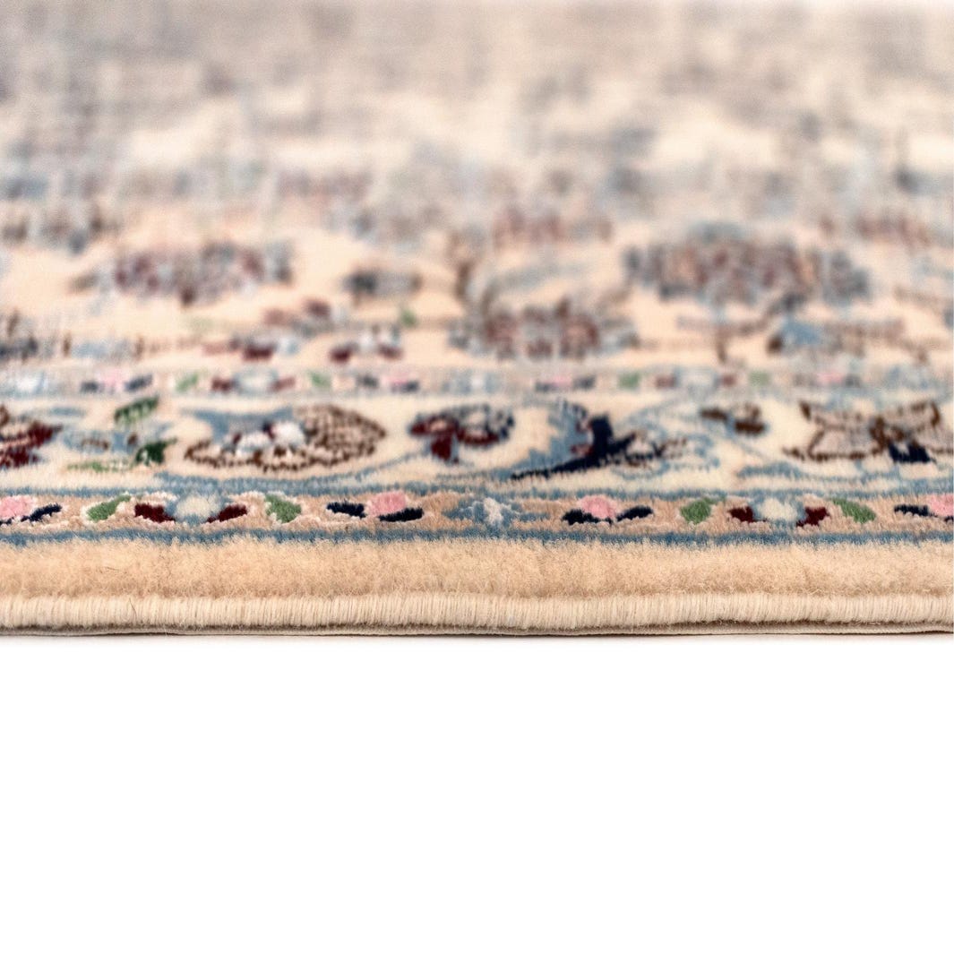 The Nain collection presents a 7x10 hand-crafted rug made of a harmonious blend of wool and silk. This rug displays an intricate floral pattern with a sophisticated color palette that includes shades of navy, taupe, and slate, all set against a soft beige background. The meticulous detailing in the pattern imparts a sense of tradition and timelessness, making this rug an ideal choice for classic and formal spaces.