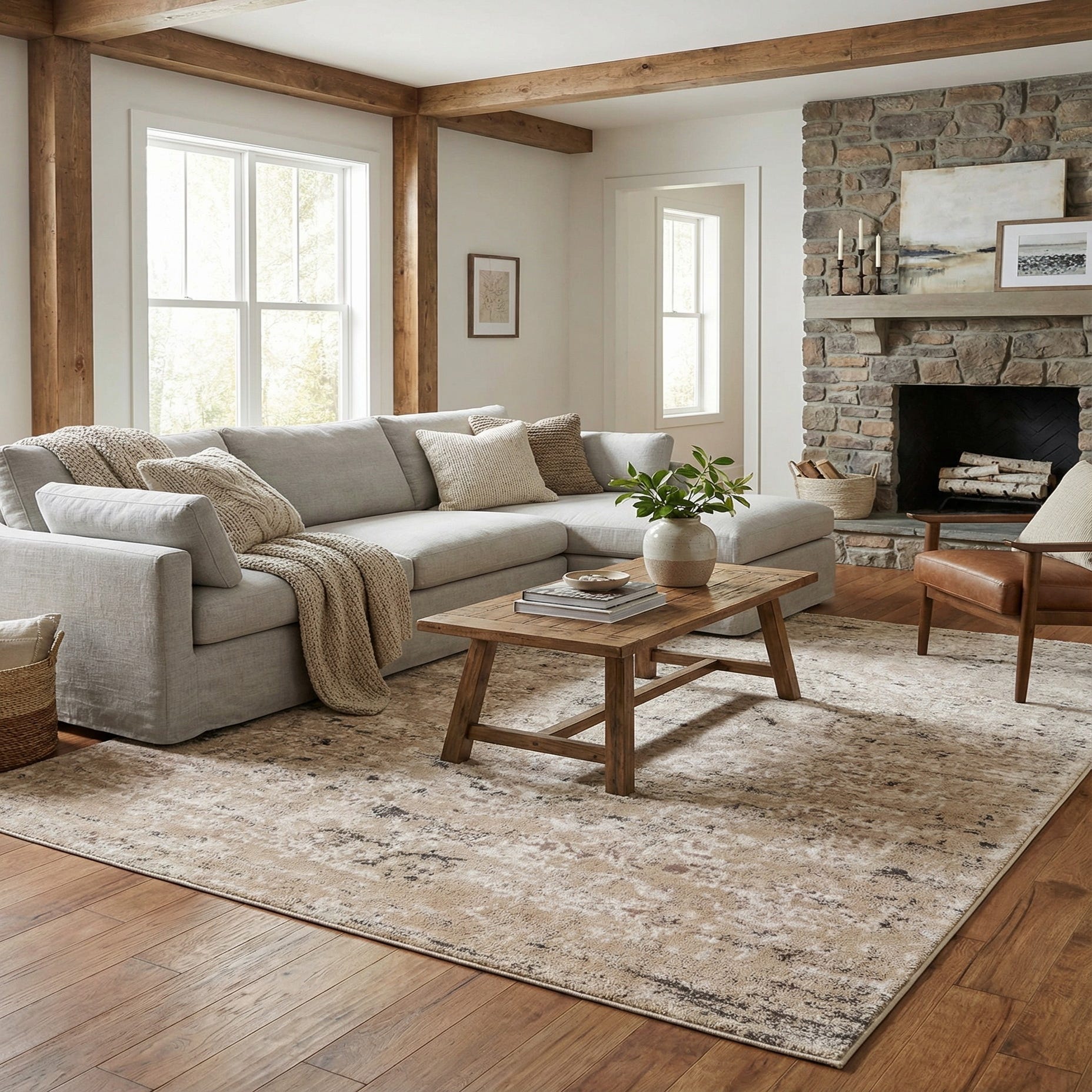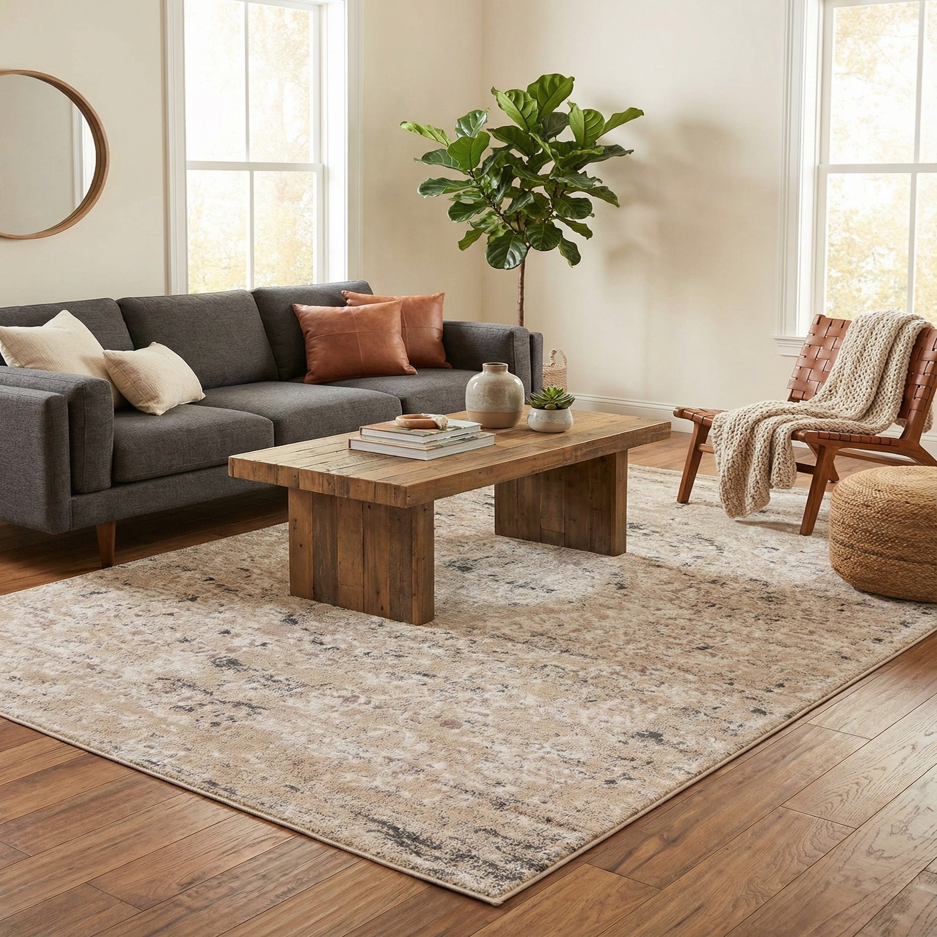 This neutral palette and understated pattern work well in a range of interiors — pair it with warm wood furniture for a relaxed transitional look, layer it beneath a sectional in a contemporary living room, or use it to soften a simple bedroom scheme. It also makes an inviting foundation for coastal, farmhouse, or modern-minimal decor where a calm, textural base is needed.