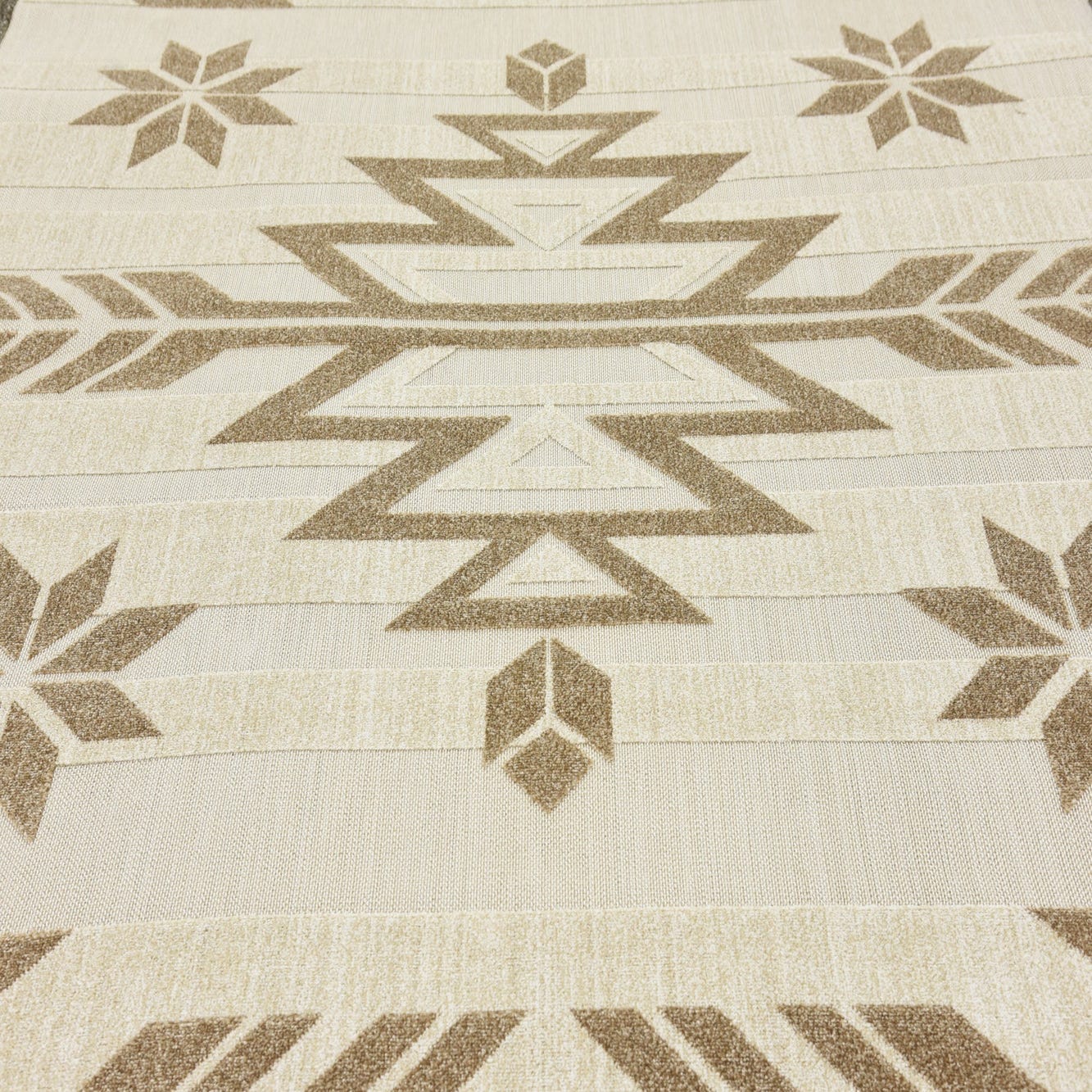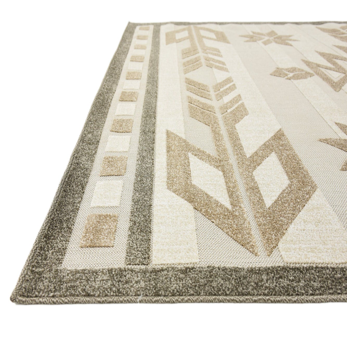 A geometric, Southwestern-inspired pattern plays across a beige field, with stacked diamond forms, arrow bands and star-like medallions rendered in brown and light brown. The balanced layout and framed border give the rug a structured, modern look while the neutral palette keeps it versatile. Machine-made from 100% polypropylene, the surface has a low-profile, tightly woven texture with subtle ribbing that you can feel underfoot—firm and slightly brushed rather than plush.