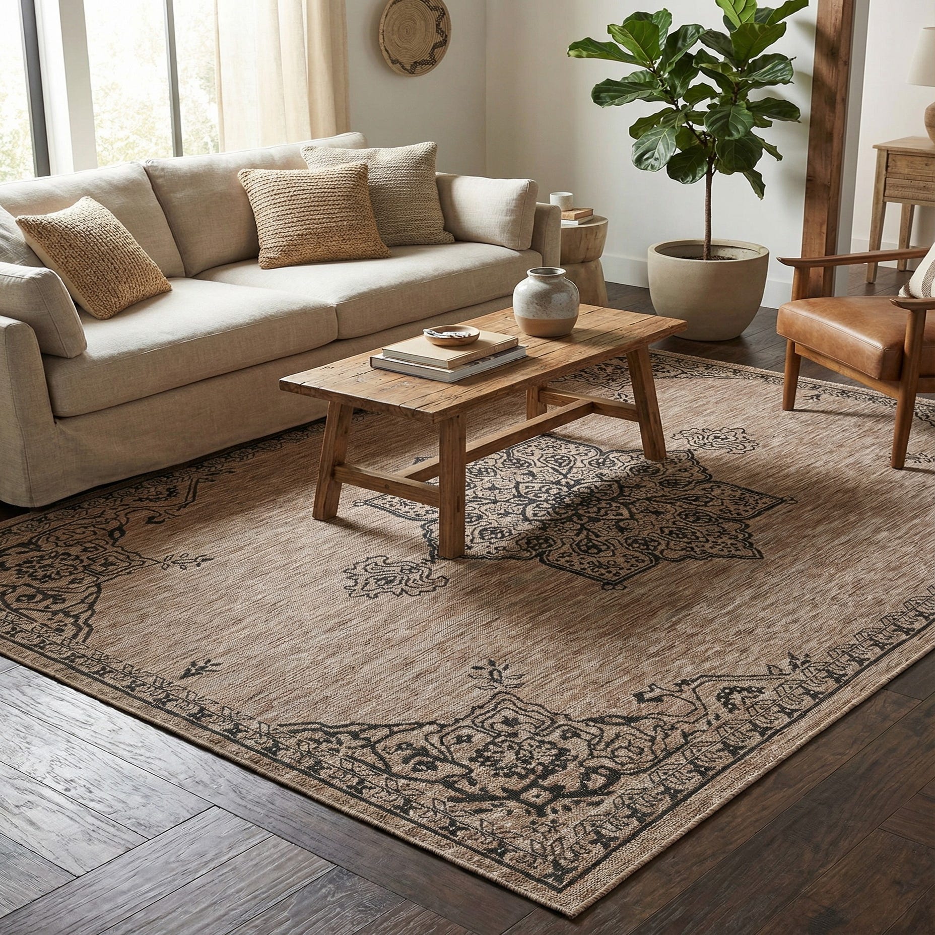 This rug works well on a covered patio or sunroom where classic styling meets outdoor durability, and it also anchors living and dining areas with a relaxed, traditional feel. Pair it with dark metal or teak furniture for contrast, soft linen upholstery for a layered neutral palette, or mixed-pattern throw pillows when a bit of visual interest is desired. Its understated colorway and defined pattern make it easy to coordinate with transitional, farmhouse, or coastal-inspired interiors.