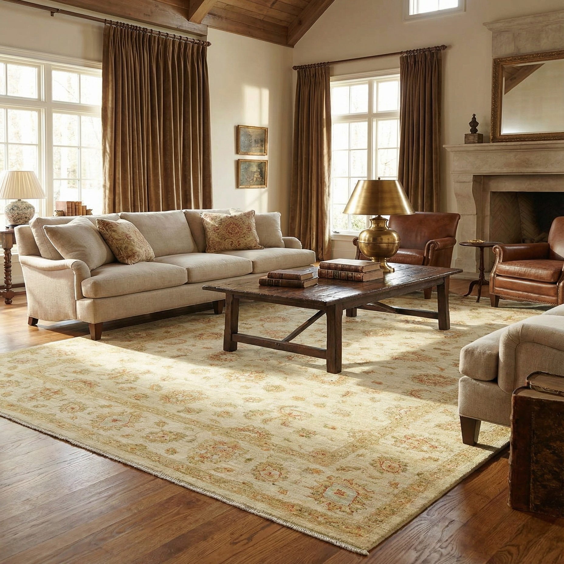 This Peshawar Ziegler rug, measuring 7x10, is hand-knotted from 100% hand-spun wool, offering both durability and a soft texture underfoot. The design features a classic array of floral and botanical motifs spread elegantly across a beige background. Complementary colors include tasteful shades of blue, brown, gold, red, and olive which create a harmonious palette that is versatile and warm.