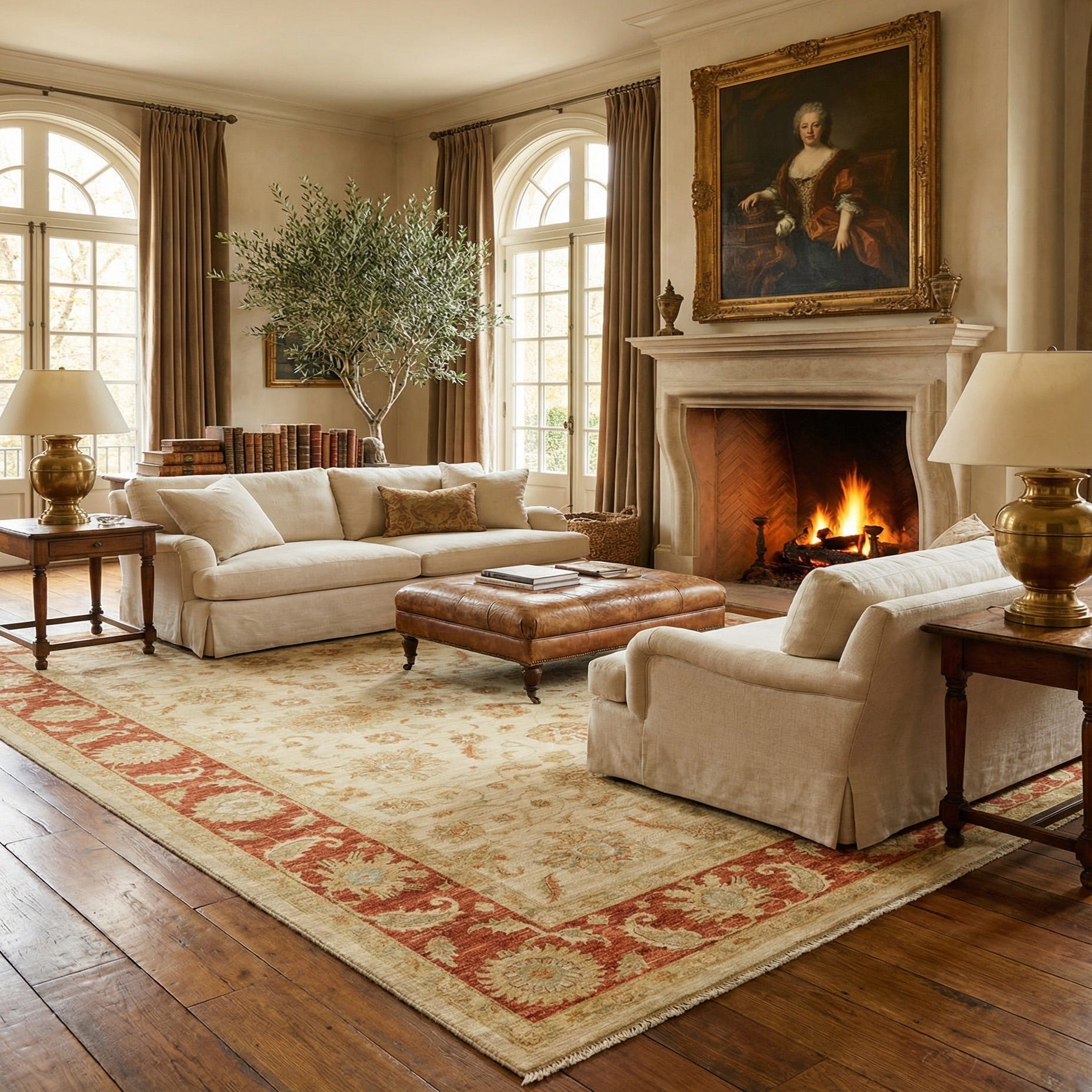 Primary color is Beige. Colors in this rug include: Beige, Blue, Brown, Rust Red, Olive.