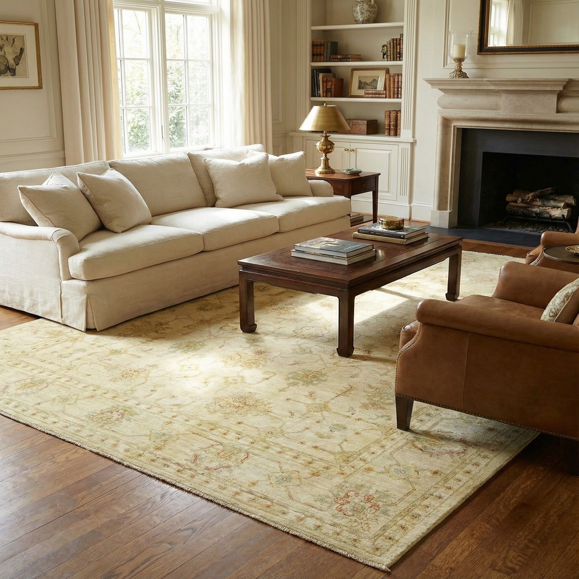A 7x10 rectangular Peshawar Ziegler rug in cream and tan with a traditional botanical pattern and floral motifs.