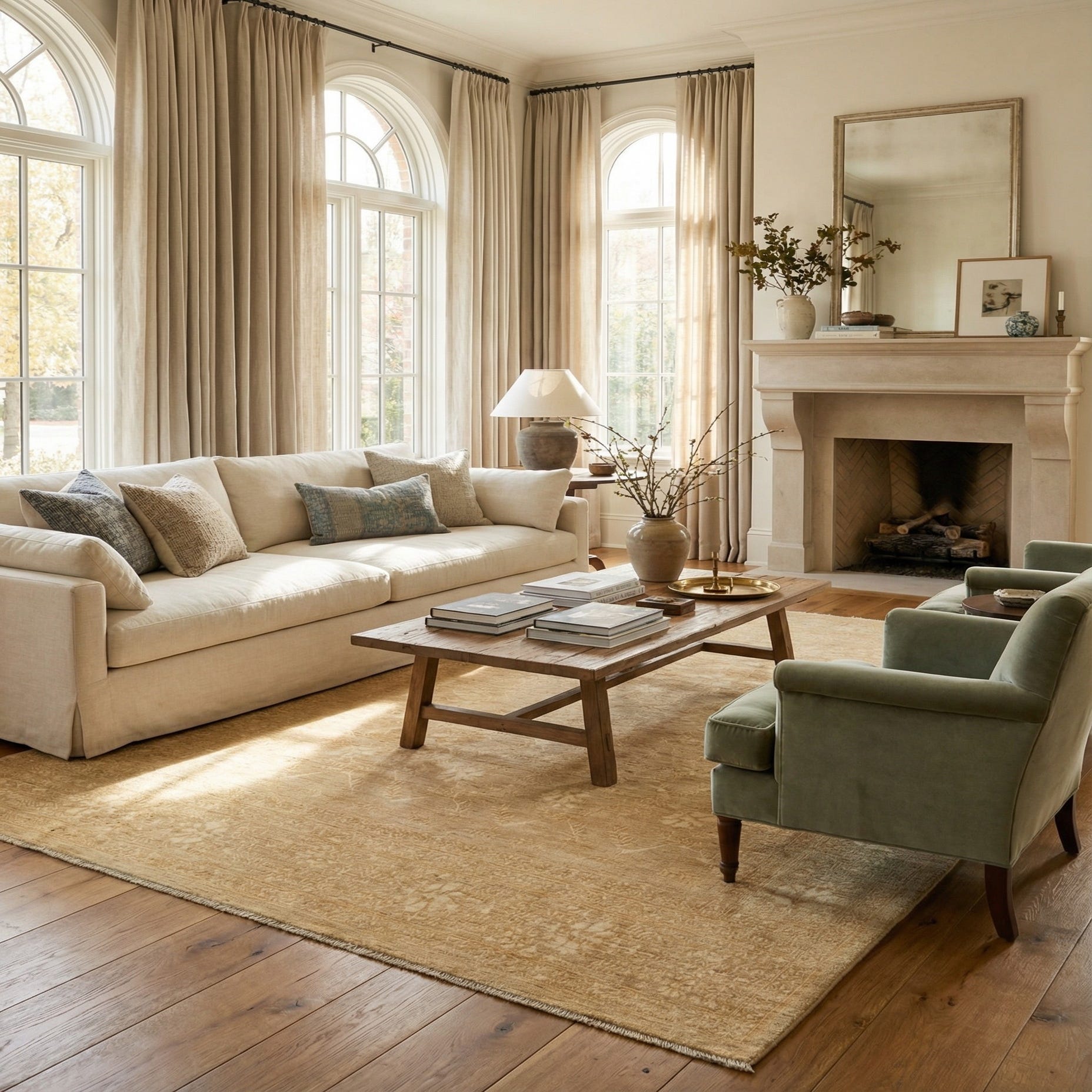 Primary color is Beige. Colors in this rug include: Beige, Gold, Ivory.