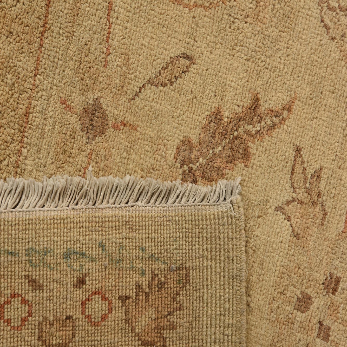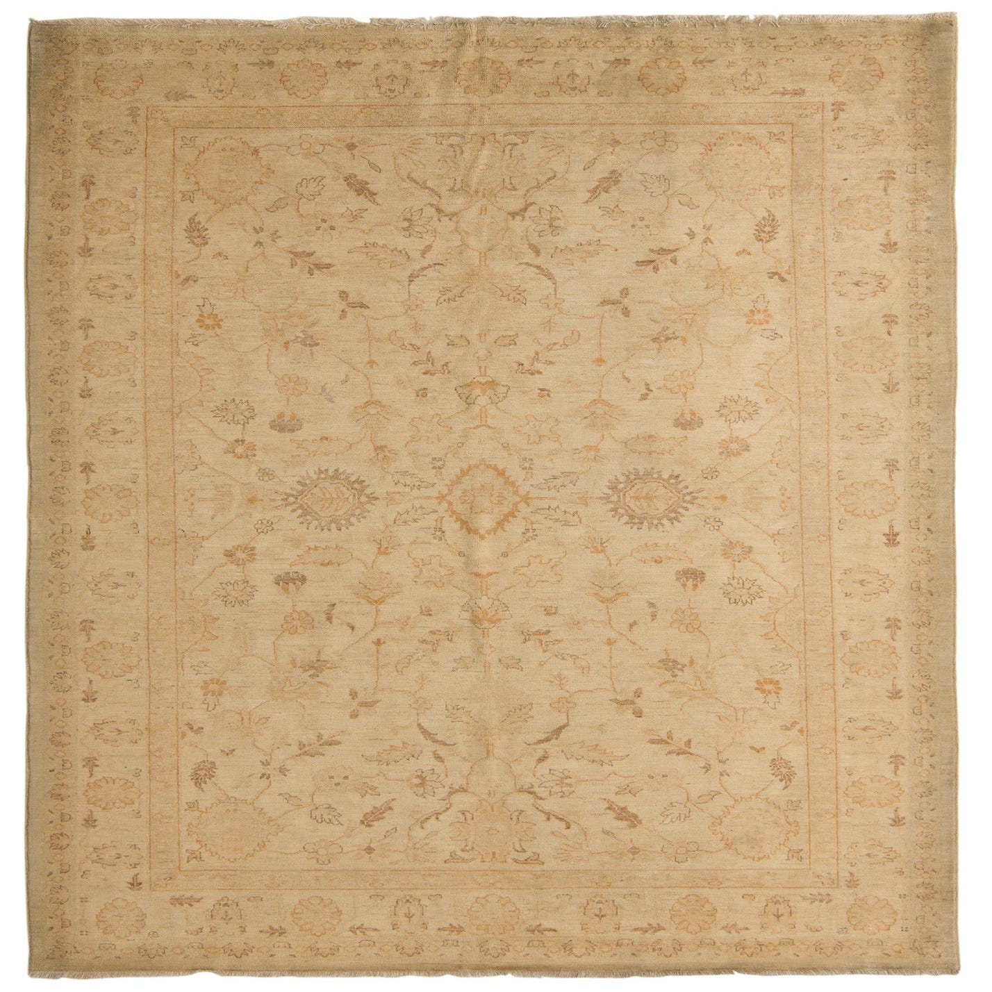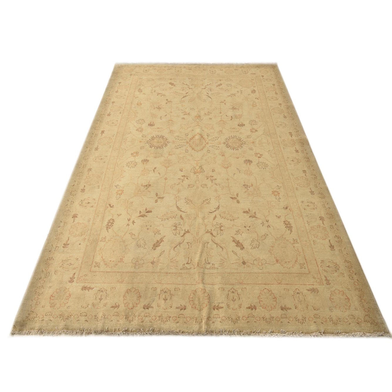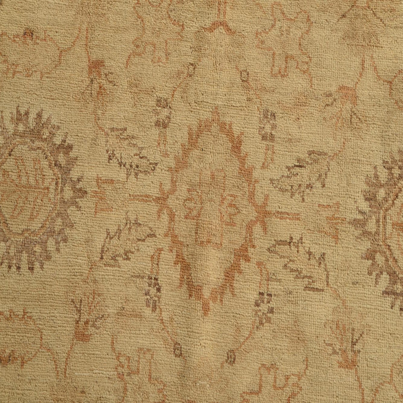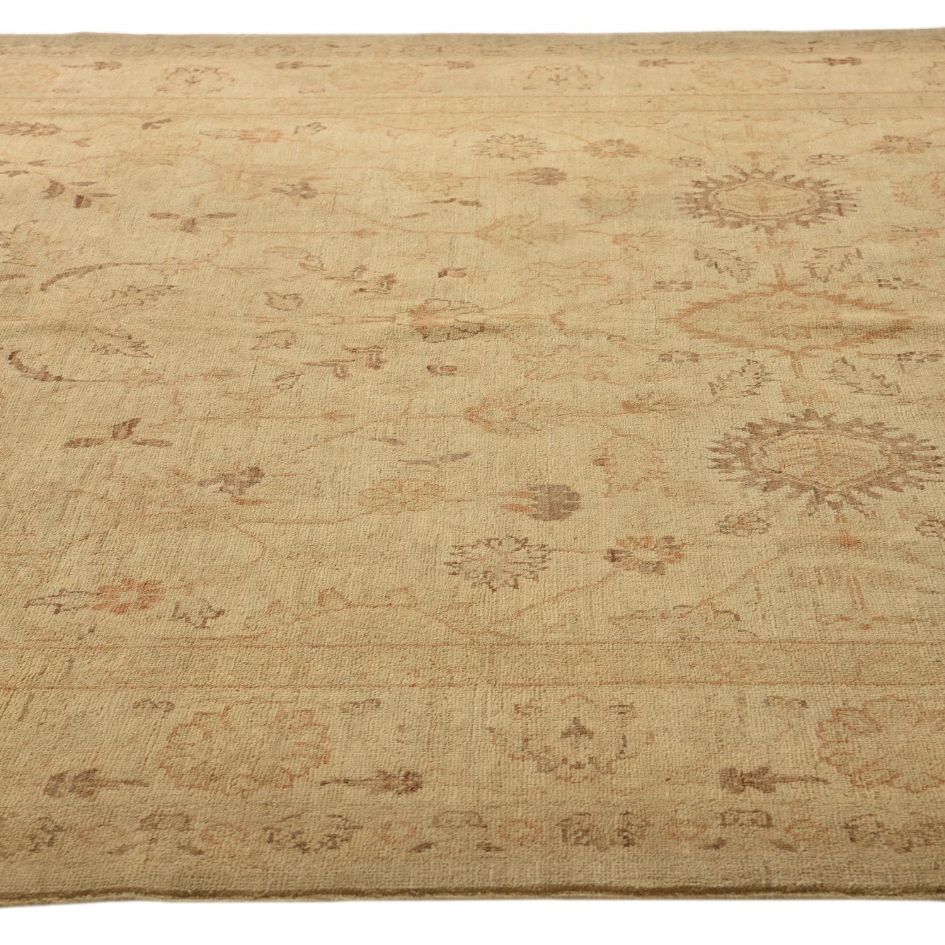 A low-contrast floral field and soft border give this hand-knotted rug a refined, lived-in character. The background is a warm beige, with botanical motifs and medallion accents worked in shades of brown, light brown, gold, and ivory. Woven from 100% hand-spun wool, the pile has a gentle, tactile density—soft underfoot with a matte, natural luster that highlights the subtle color variations and slightly faded, antique-inspired pattern.