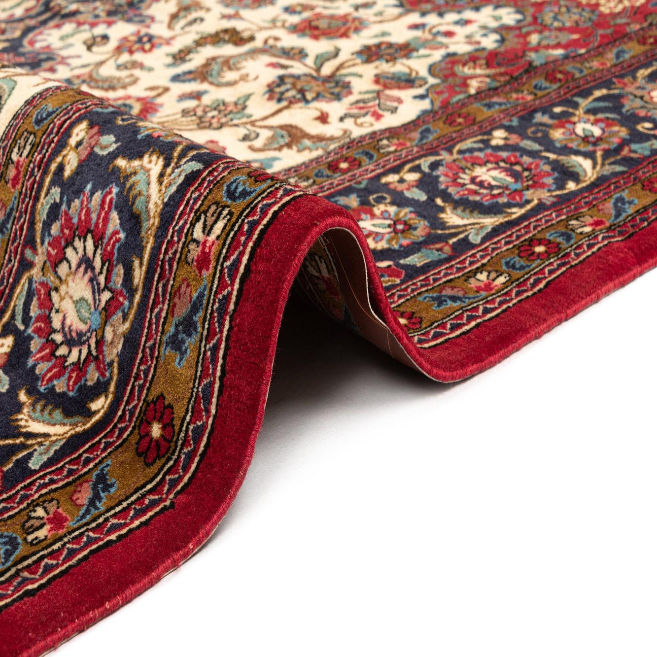 A 7x10 rectangular Persian rug featuring a cream field with intricate floral patterns, a deep red border, and a central navy medallion.