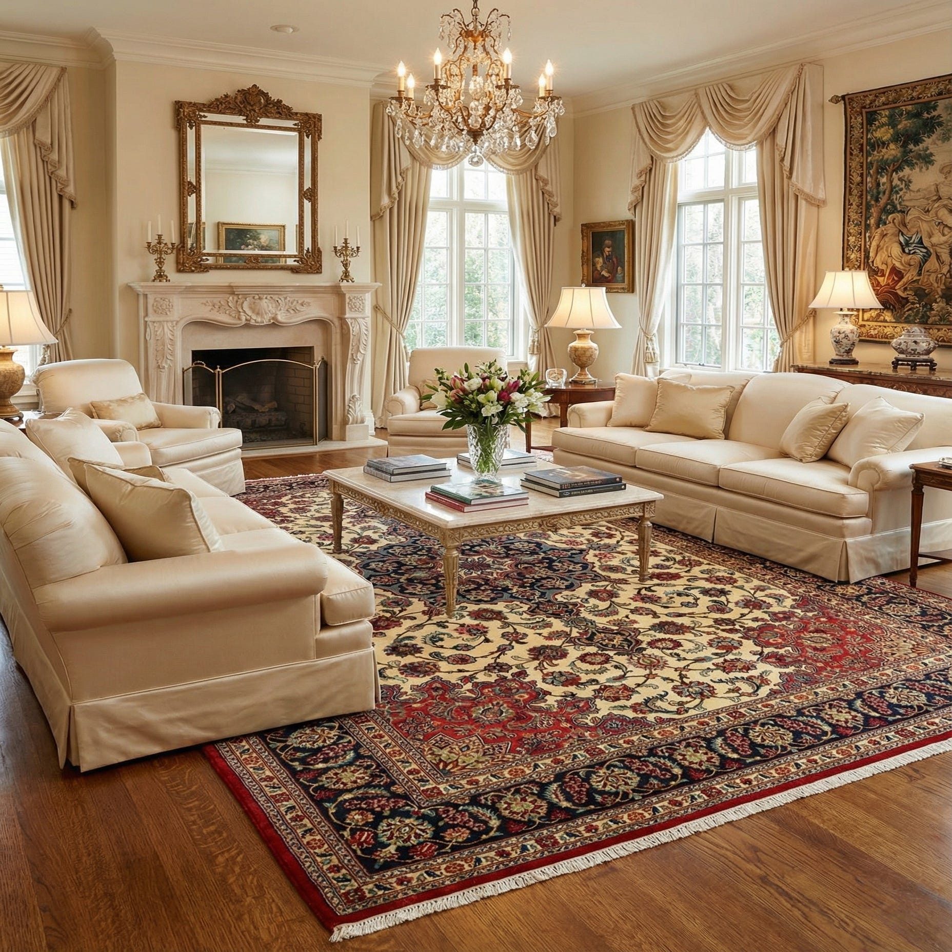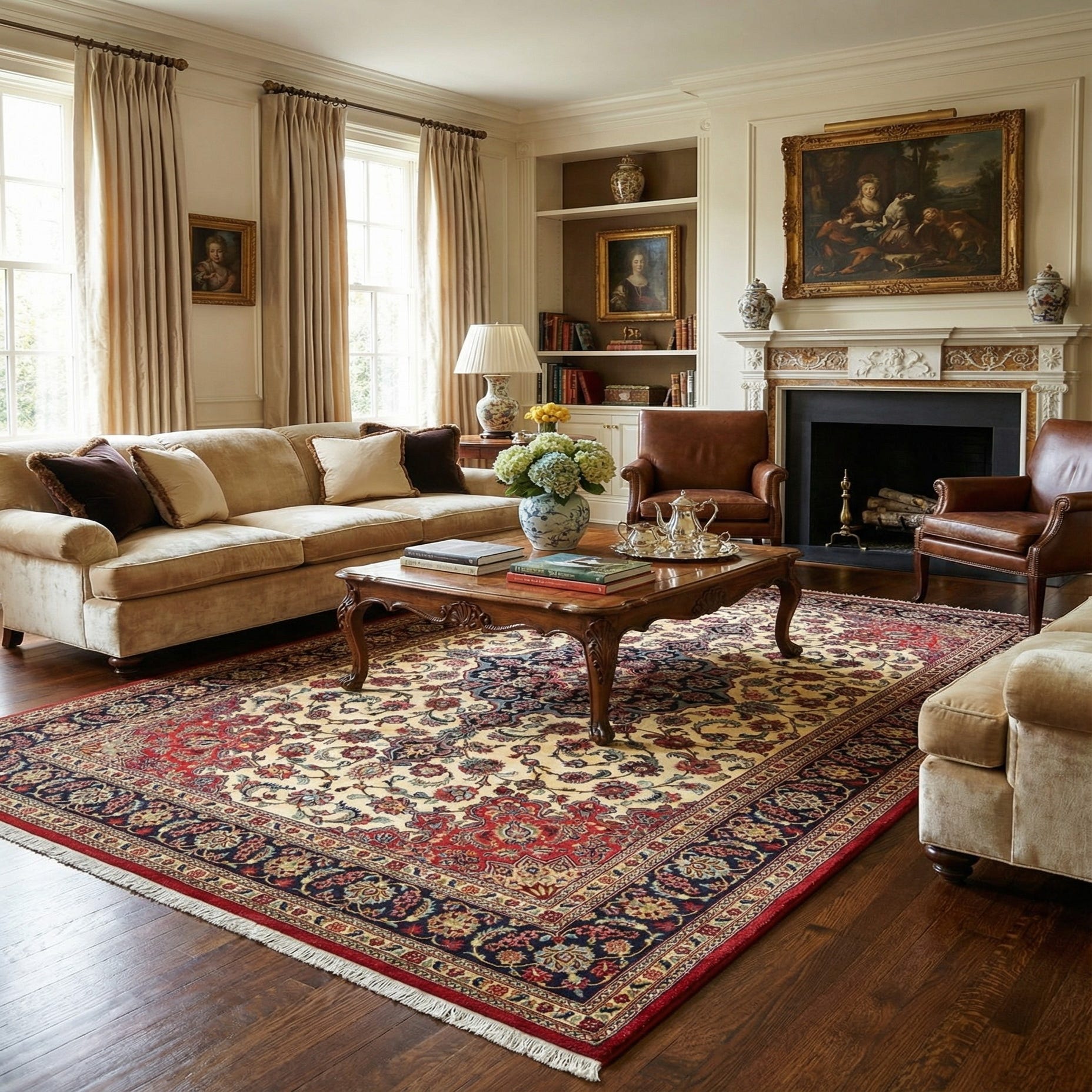 Hand-knotted in wool, the surface has a tactile, densely knotted feel and a natural, low sheen from the fibers. Place it beneath a seating group to anchor a living room, under a dining table for a refined dining area, or in a study or entry hall where its pattern and palette can set a composed, layered tone. It pairs well with warm wood finishes, leather furniture, classic upholstered pieces in jewel tones or neutrals, and painted millwork for a pulled-together, lived-in elegance.