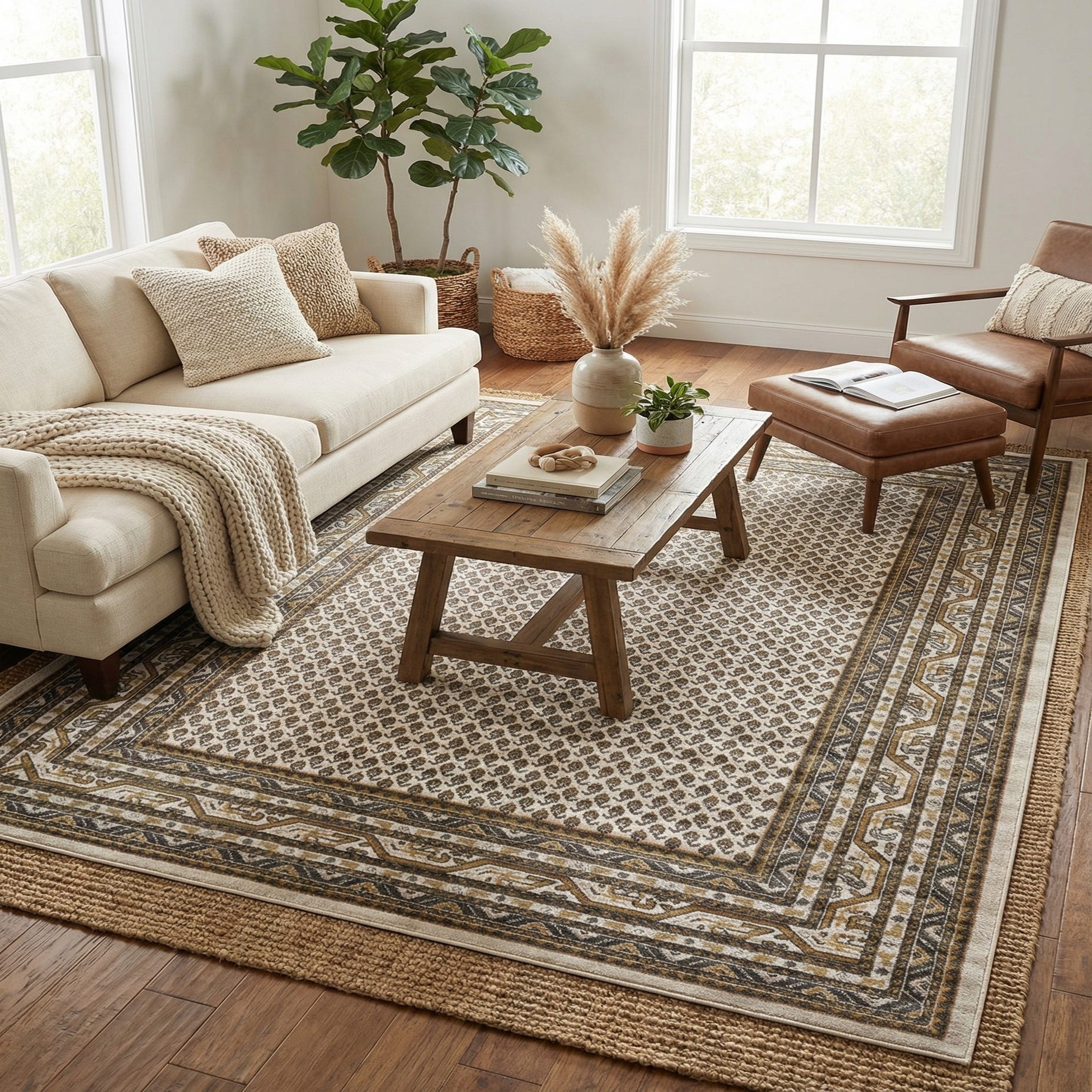 This neutral palette and tailored pattern suit a range of interiors: place it under a sofa grouping to anchor a living room, beneath a dining table for a composed dining area, or as a grounding layer in a home office or bedroom. The beige and gold tones warm wood finishes and brass hardware, while the gray and ivory details allow easy pairing with cool-toned upholstery and metal accents. Its low-profile construction also tucks neatly under furniture legs for a clean, tailored look.