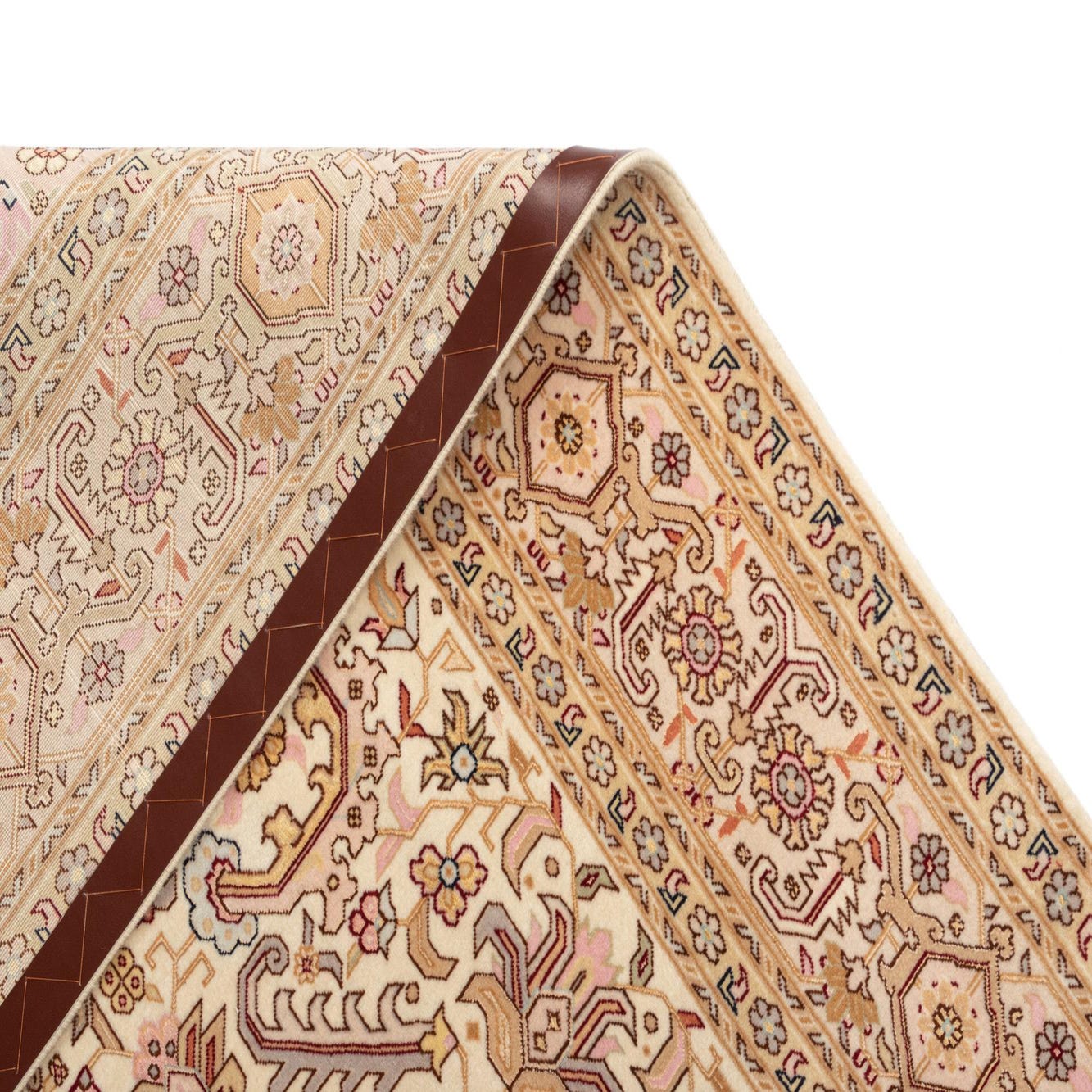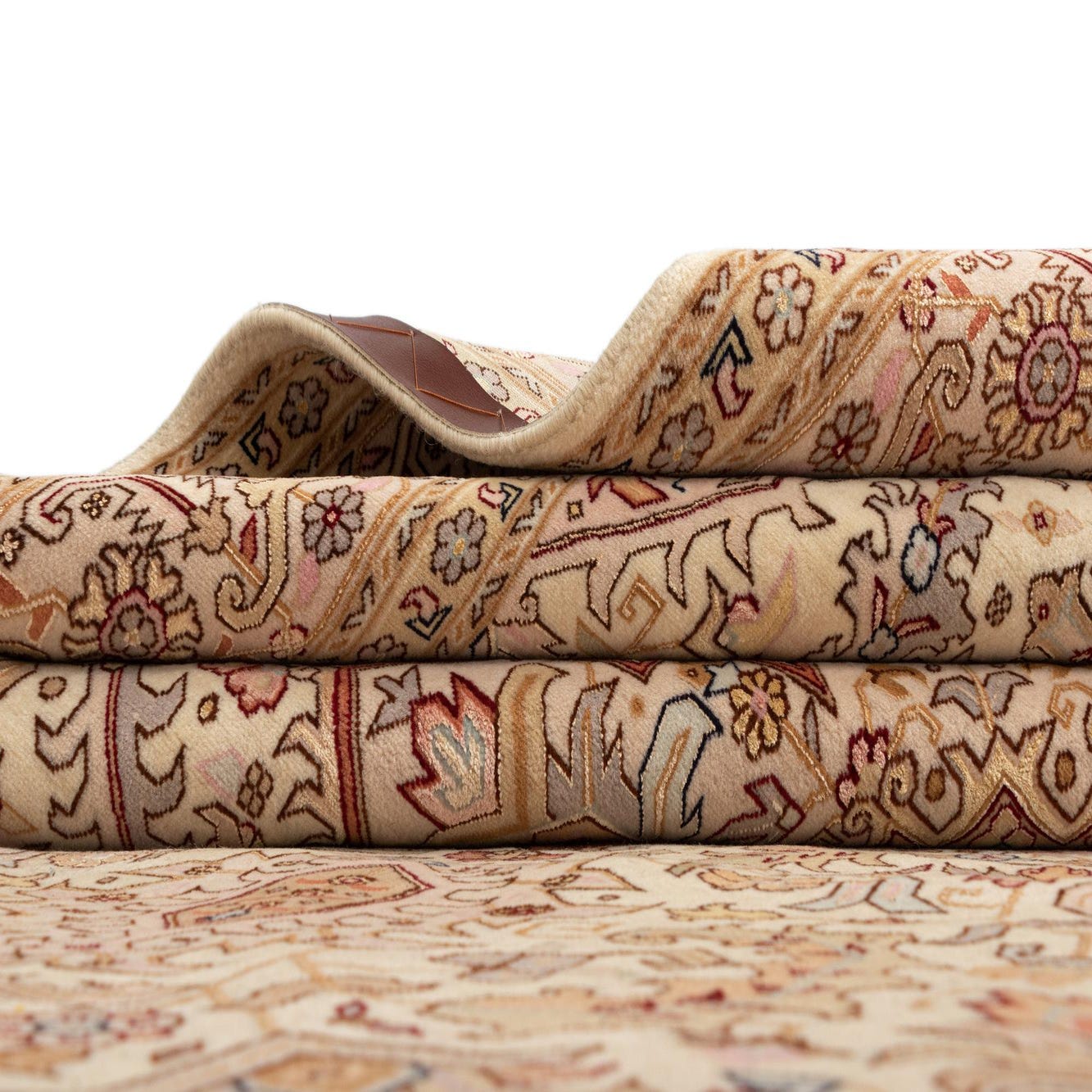 The Tabriz collection presents a refined 7x10 hand-made rug, meticulously crafted from a blend of wool and silk, creating a luminous sheen and a soft yet durable texture. This piece showcases a classic beauty with an ornate central medallion and an intricate border that exhibits elements of traditional Persian design. The harmonious color palette includes shades of beige, pink, cream, olive, grey, brown, yellow, and light blue, all set against a unifying beige background that promotes versatility and elegance.