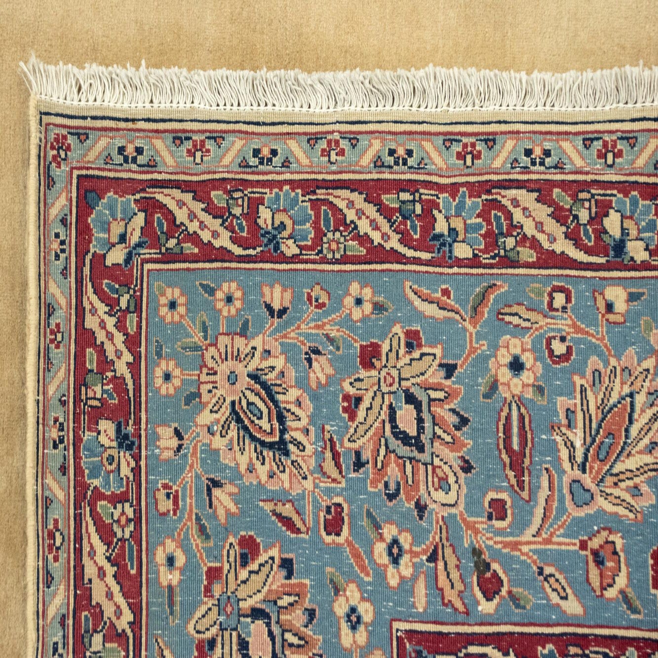 This Tabriz collection area rug boasts a sophisticated design with a beige background complemented by a richly detailed border featuring hues of blue, red, and cream. The hand-knotted construction reflects meticulous craftsmanship, and the use of 100% wool lends a tangible warmth and resilience to the piece. Its texture is invitingly soft to the touch, yet promises durability for high-traffic areas.