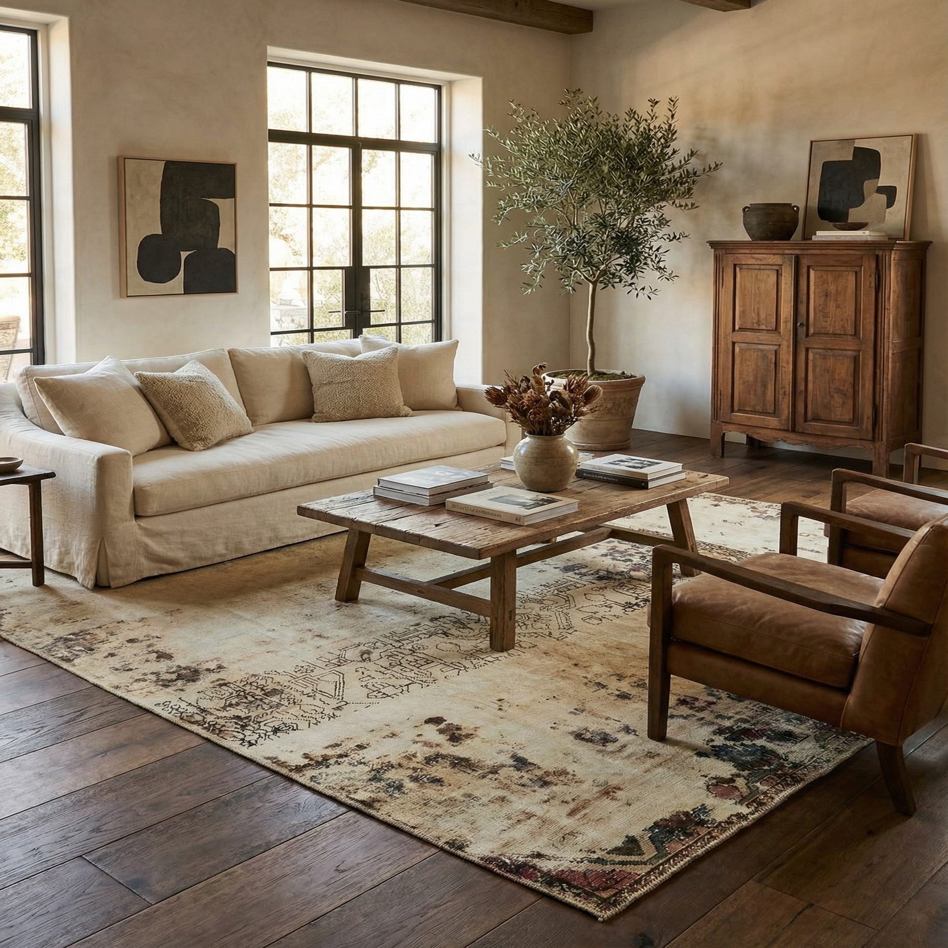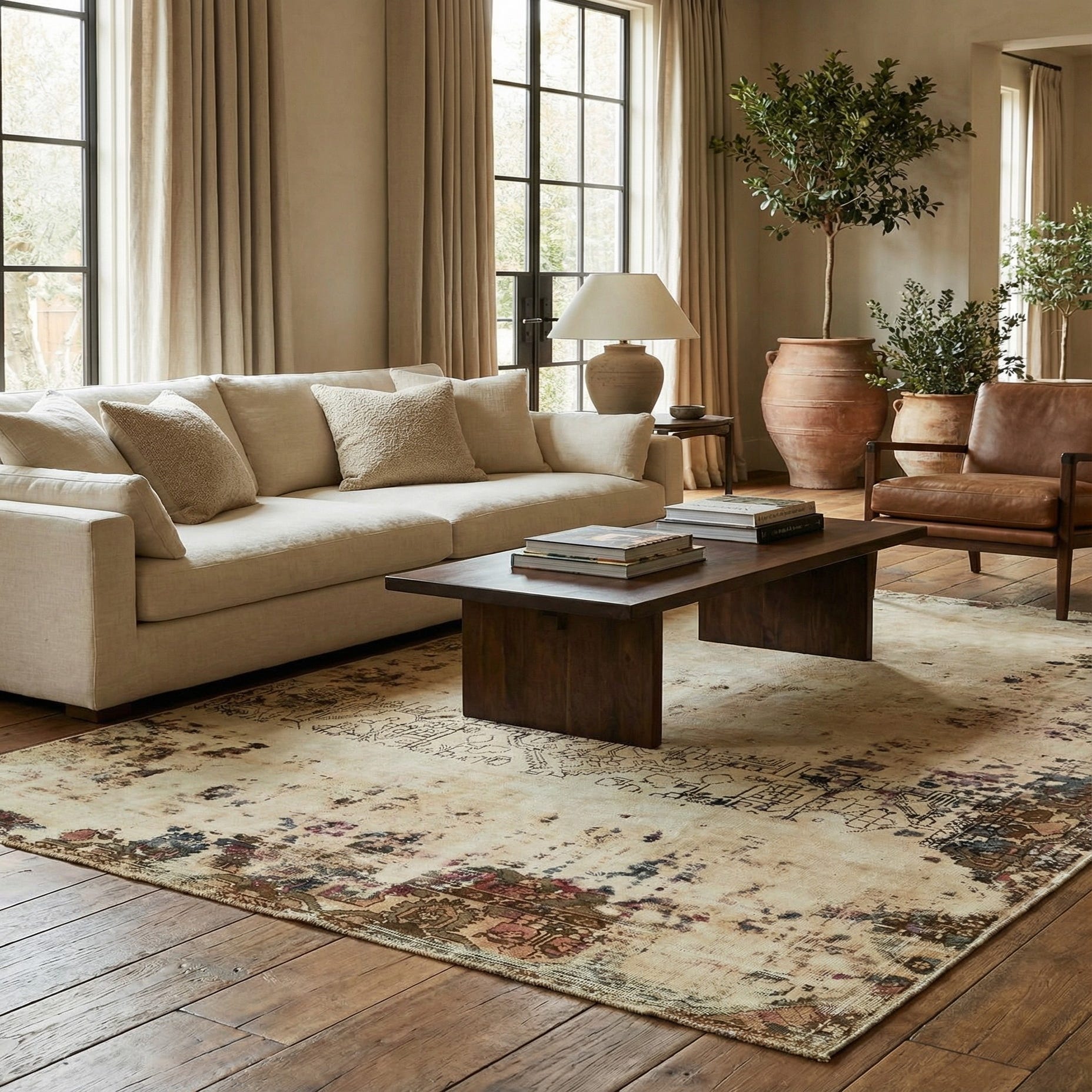 A 7x10 rectangular Ultra Vintage wool rug with a distressed ivory and brown abstract Persian pattern, suitable for a living room.