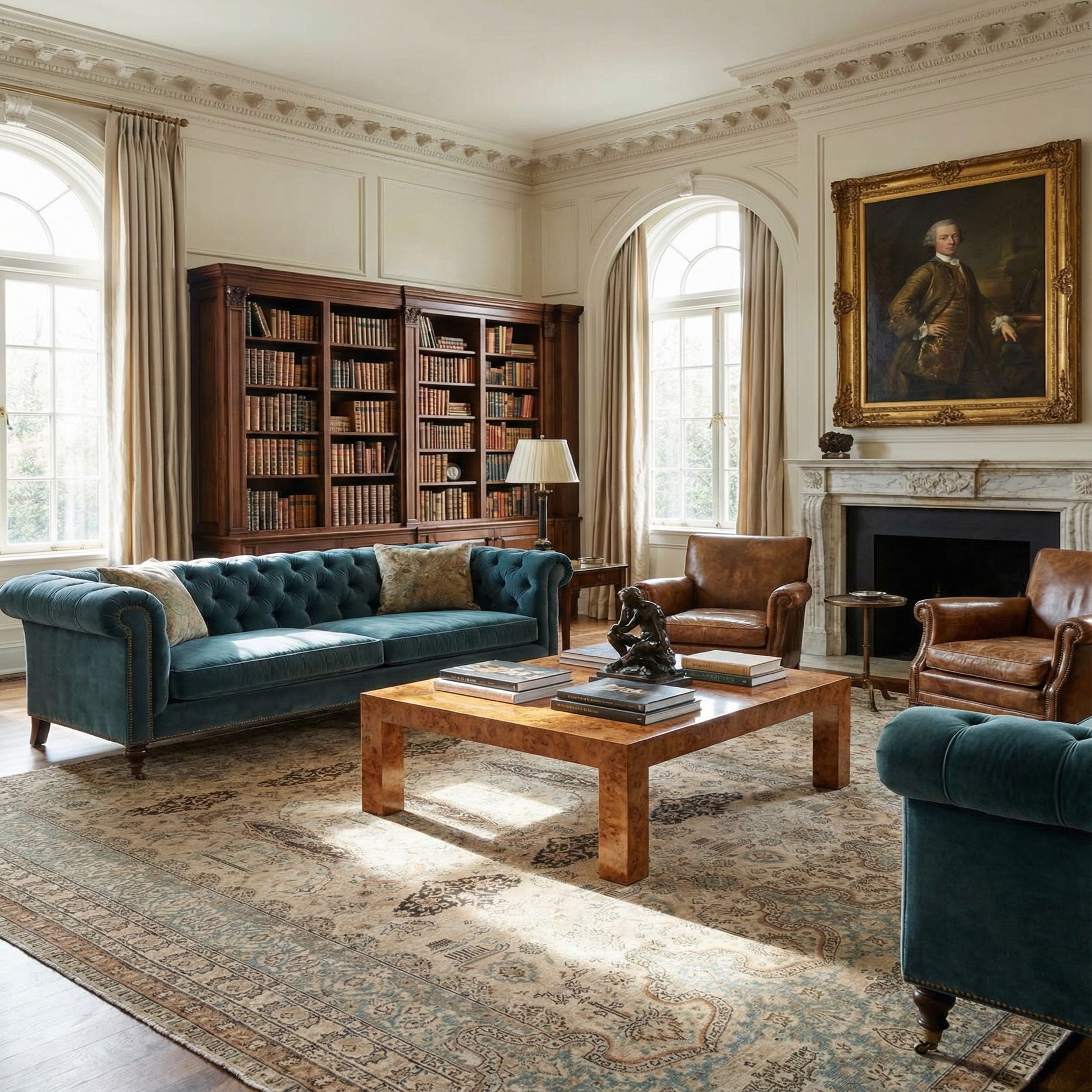 A 7x10 rectangular Ultra Vintage wool rug in browns, tans, and creams with a traditional Persian pattern, anchoring a living room with a brown leather chair and white armchair.