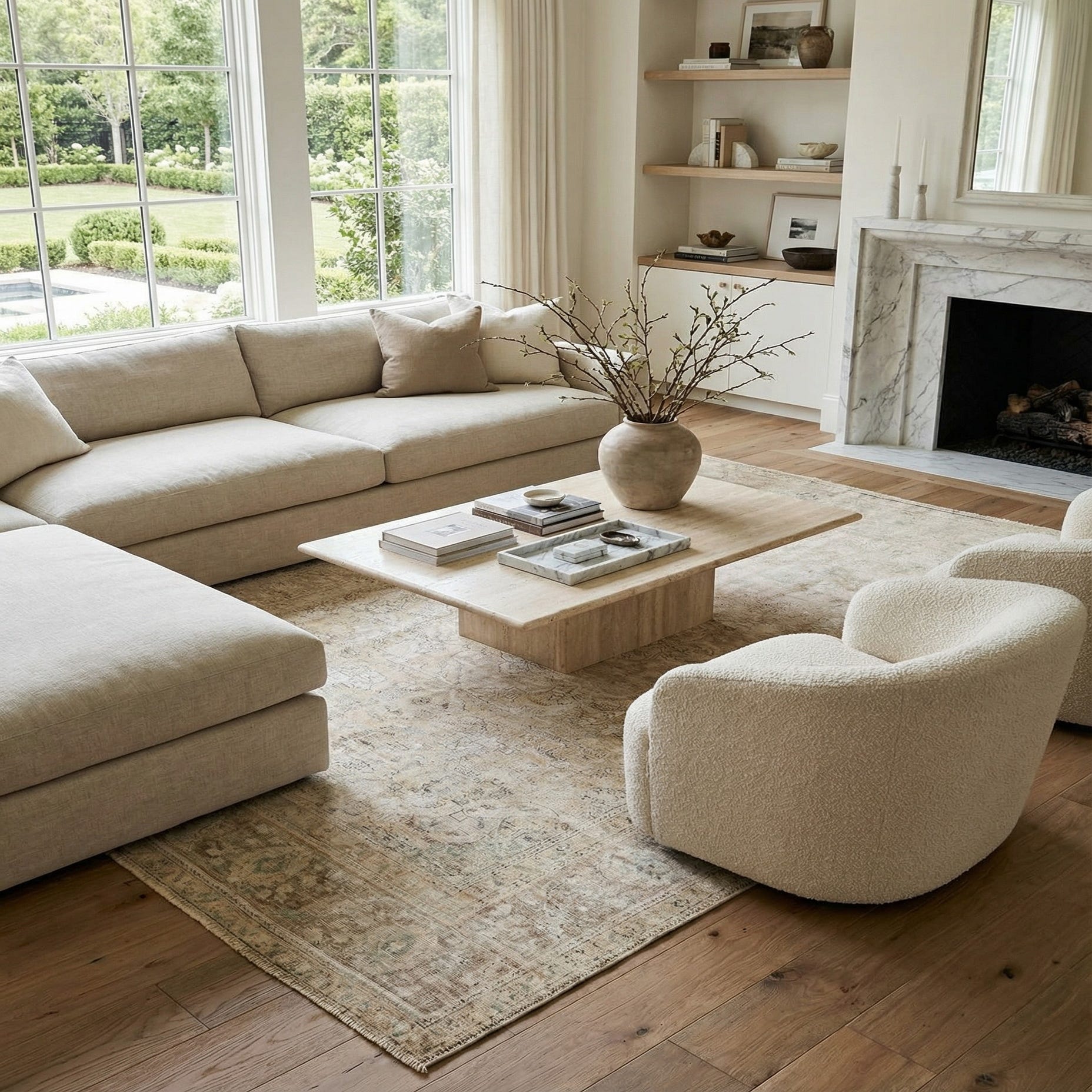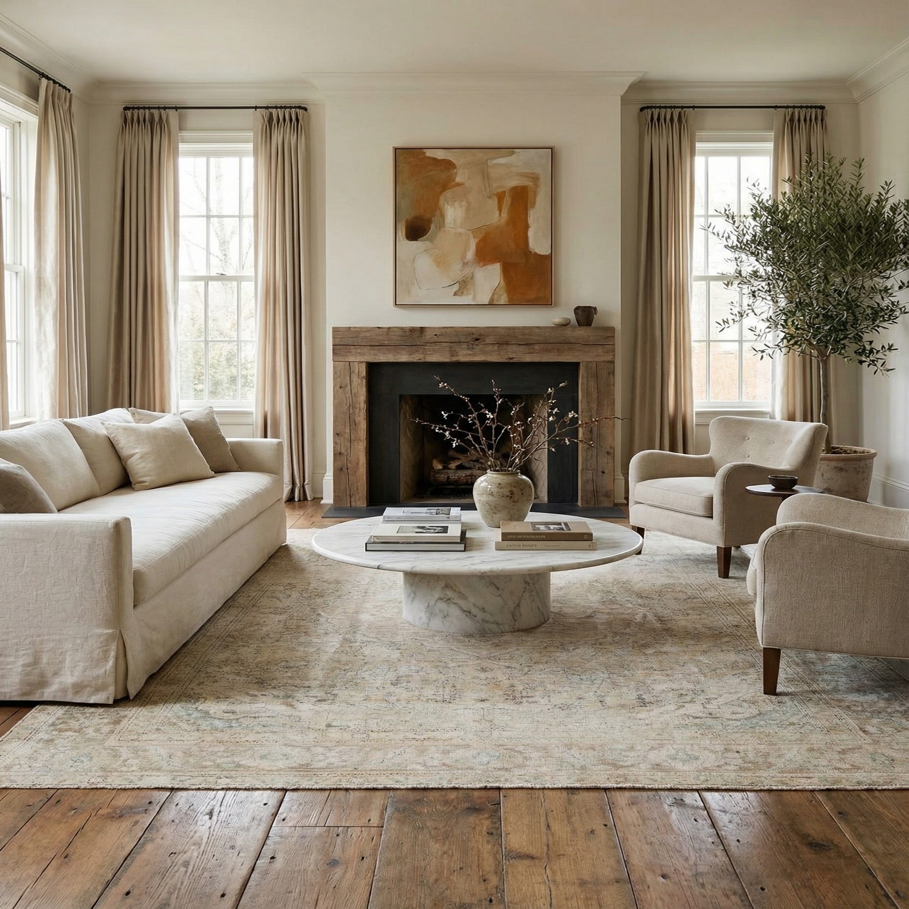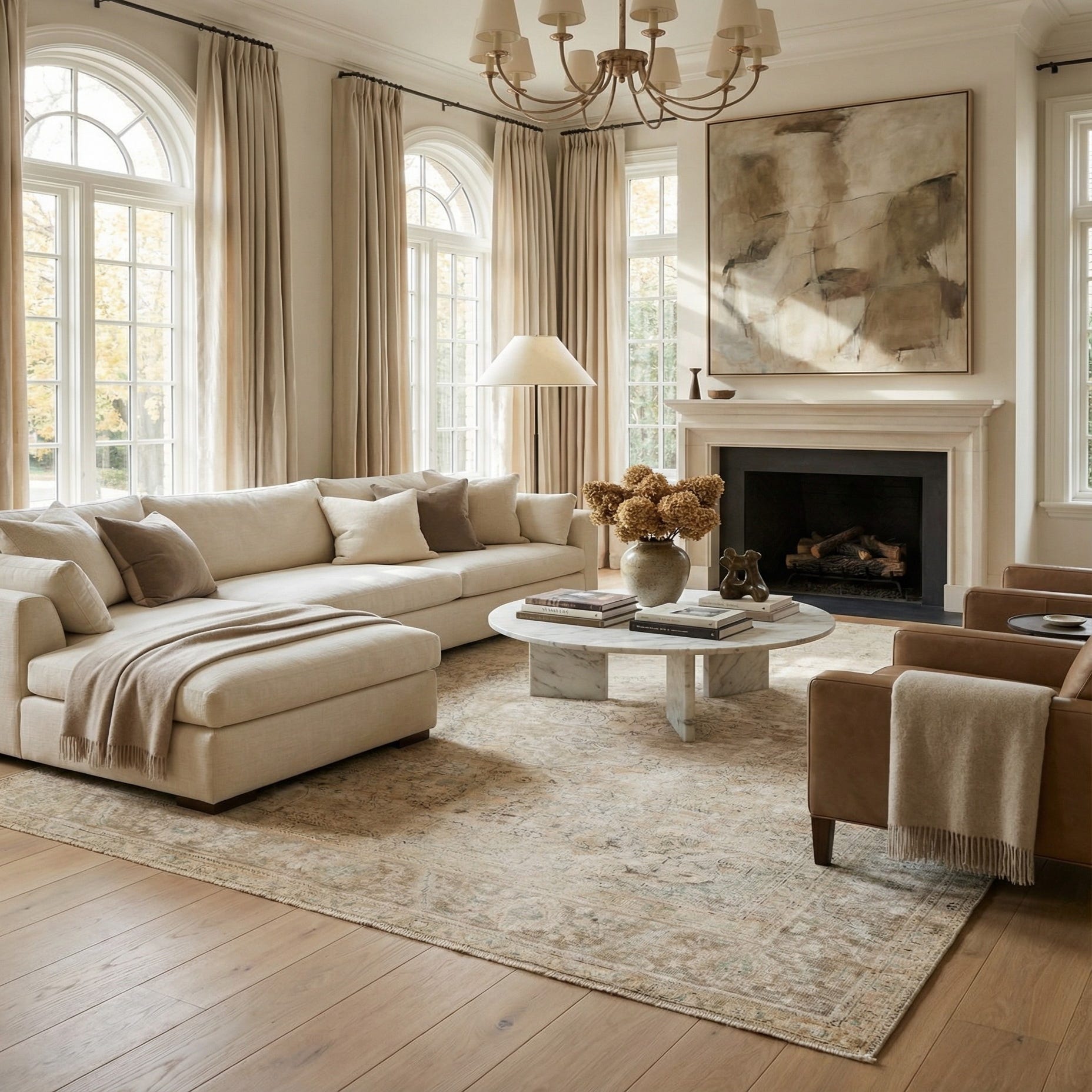 The combination of neutral tones and intricate patterns allows this rug to act as a foundational piece in a decor scheme or complement existing furnishings. It would pair well with natural wood finishes, leather furnishings, and metallic accents for a rich, layered look. This piece can also serve as a visual anchor in a minimalist setting, providing interest and warmth without overwhelming the space.
