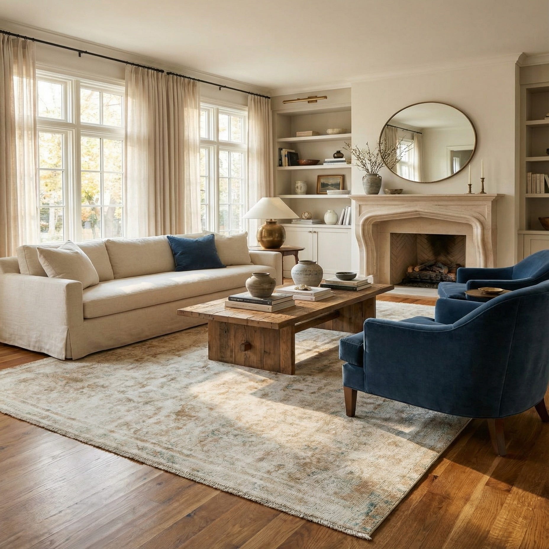 This rug's muted hues and intricate pattern allow it to seamlessly integrate into a variety of interior design scenarios. It would be particularly well suited to spaces that honor both classic and transitional arrangements, such as a formal living room, a refined study, or a serene bedroom. The quiet elegance of the color composition ensures it can accommodate a range of color schemes, from neutral to more vibrant interiors seeking a grounding element.