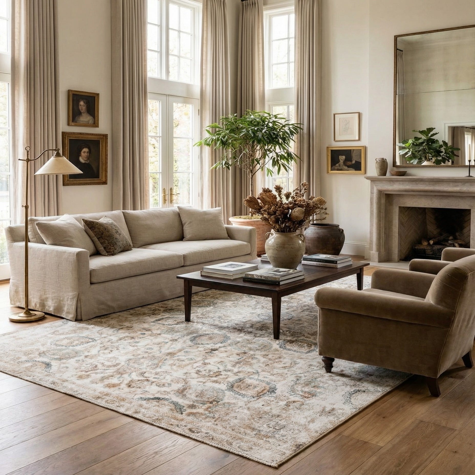 A 7x10 rectangular Rugs.com Ultra Vintage wool rug with a distressed Persian pattern in browns, tans, and creams.