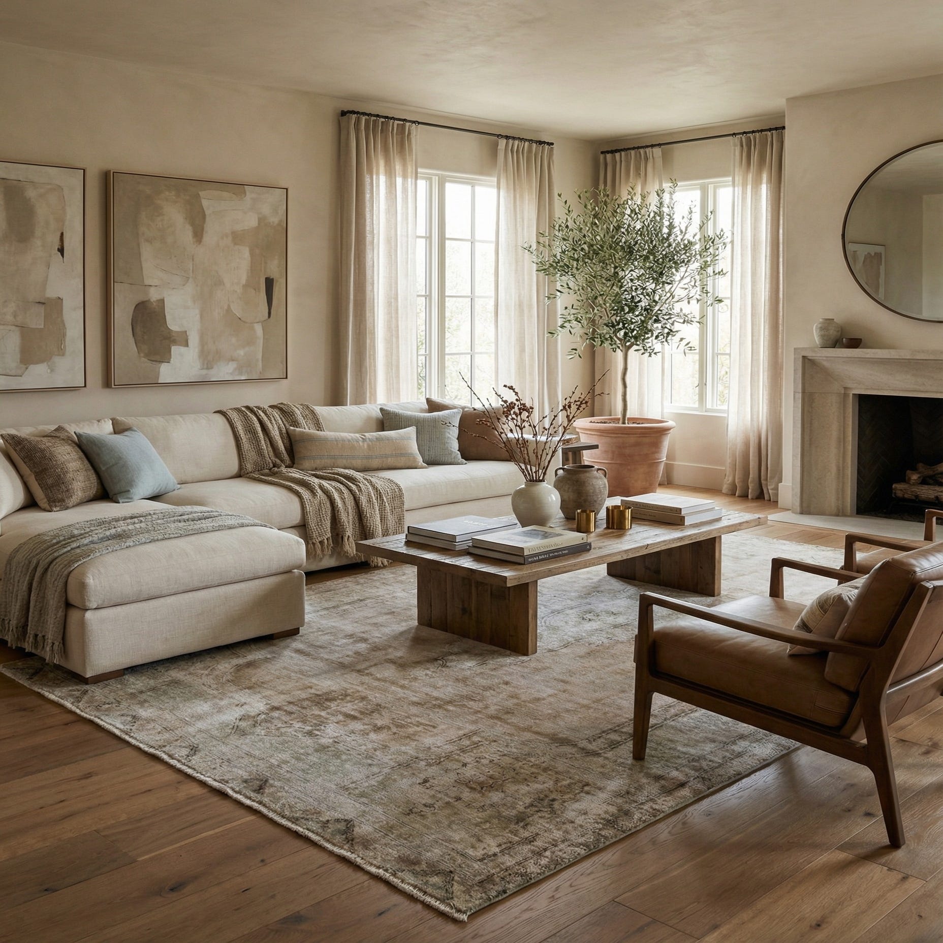 Primary color is Beige. Colors in this rug include: Beige, Brown, Olive.
