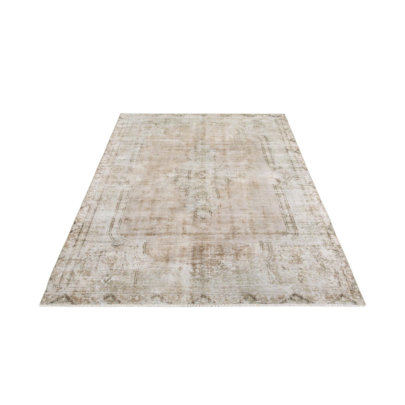 A 7x10 rectangular Ultra Vintage wool rug in shades of brown, tan, and cream with a distressed Persian medallion pattern.