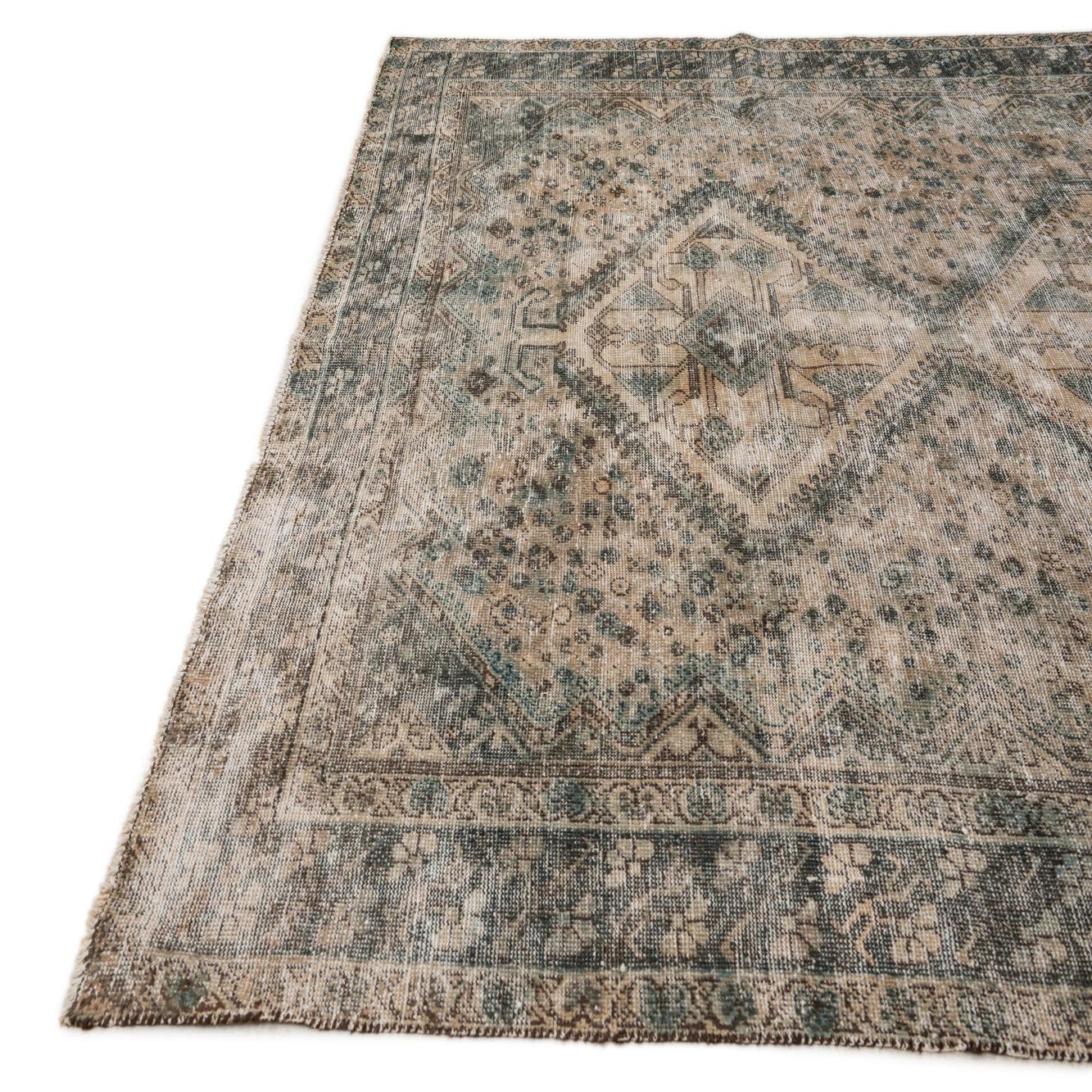 A 7x10 rectangular Ultra Vintage wool rug featuring a distressed Persian pattern in shades of brown, tan, and cream.