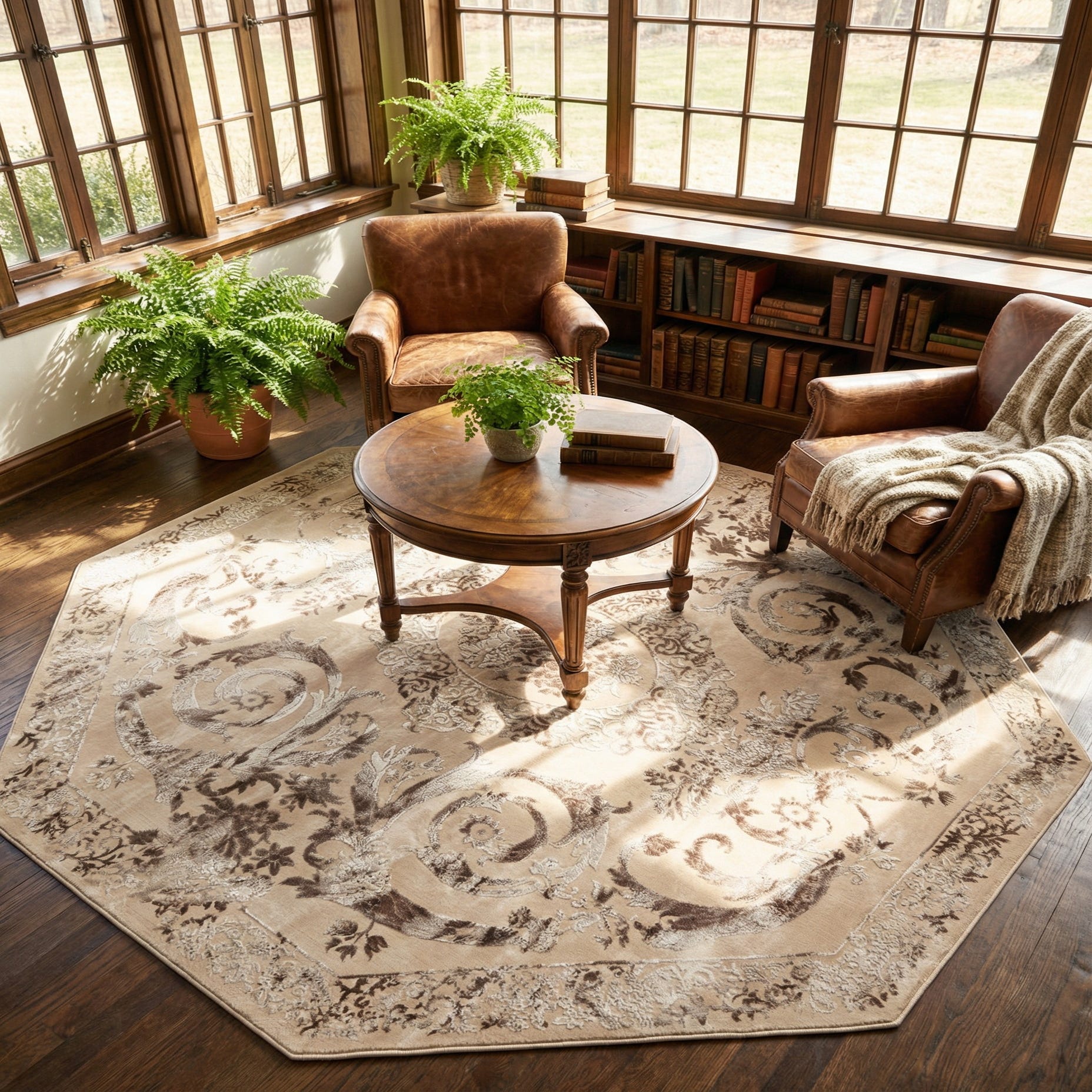 The Finsbury Collection presents a refined 8 Ft Octagon rug, machine woven with a blend of 60% polypropylene and 40% polyester, ensuring durability and a subtle sheen. This floor covering boasts a Beige background complemented by a harmonious assortment of neutral tones, including Brown, Ivory, and Light Brown. The pattern displays an elegant array of traditional motifs, offering a balanced mix of florals and intricate scrollwork that creates a sophisticated tapestry-like aesthetic.