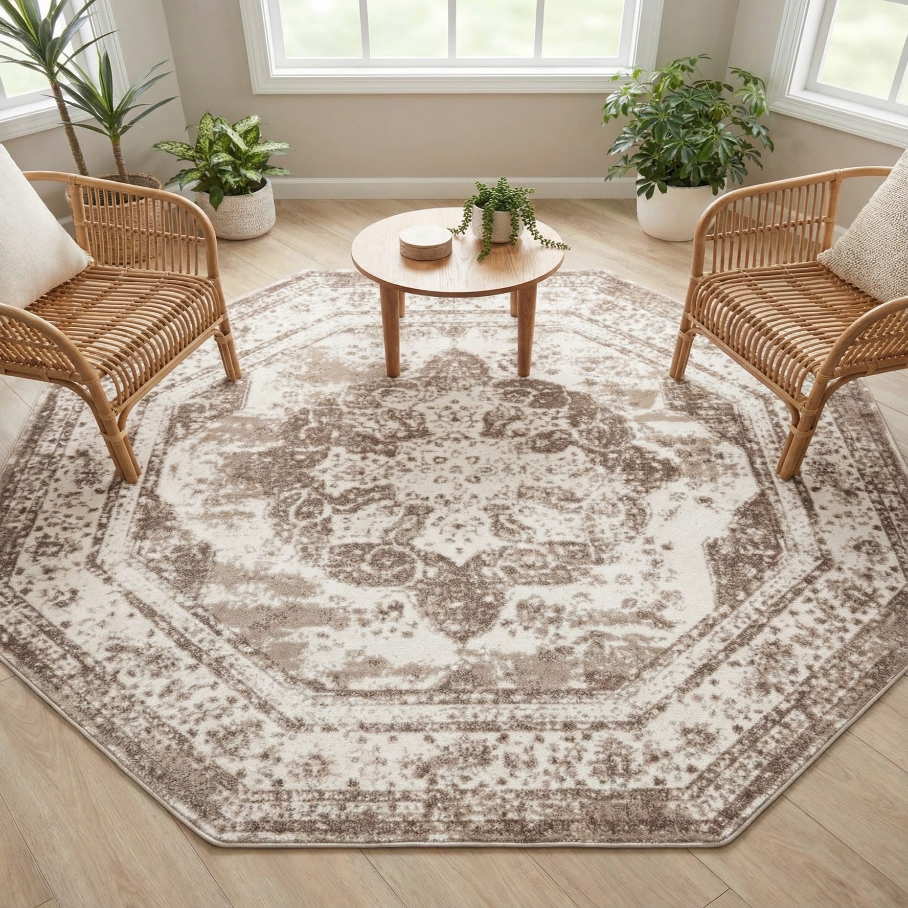 The octagonal shape works well to anchor entryways, a small seating group, or beneath a round dining table where its geometry gently offsets rectangular furniture. Its neutral beige, brown and ivory palette pairs naturally with light woods, linen upholstery, and matte metal accents, making it a fit for transitional, coastal farmhouse, or classic contemporary interiors.