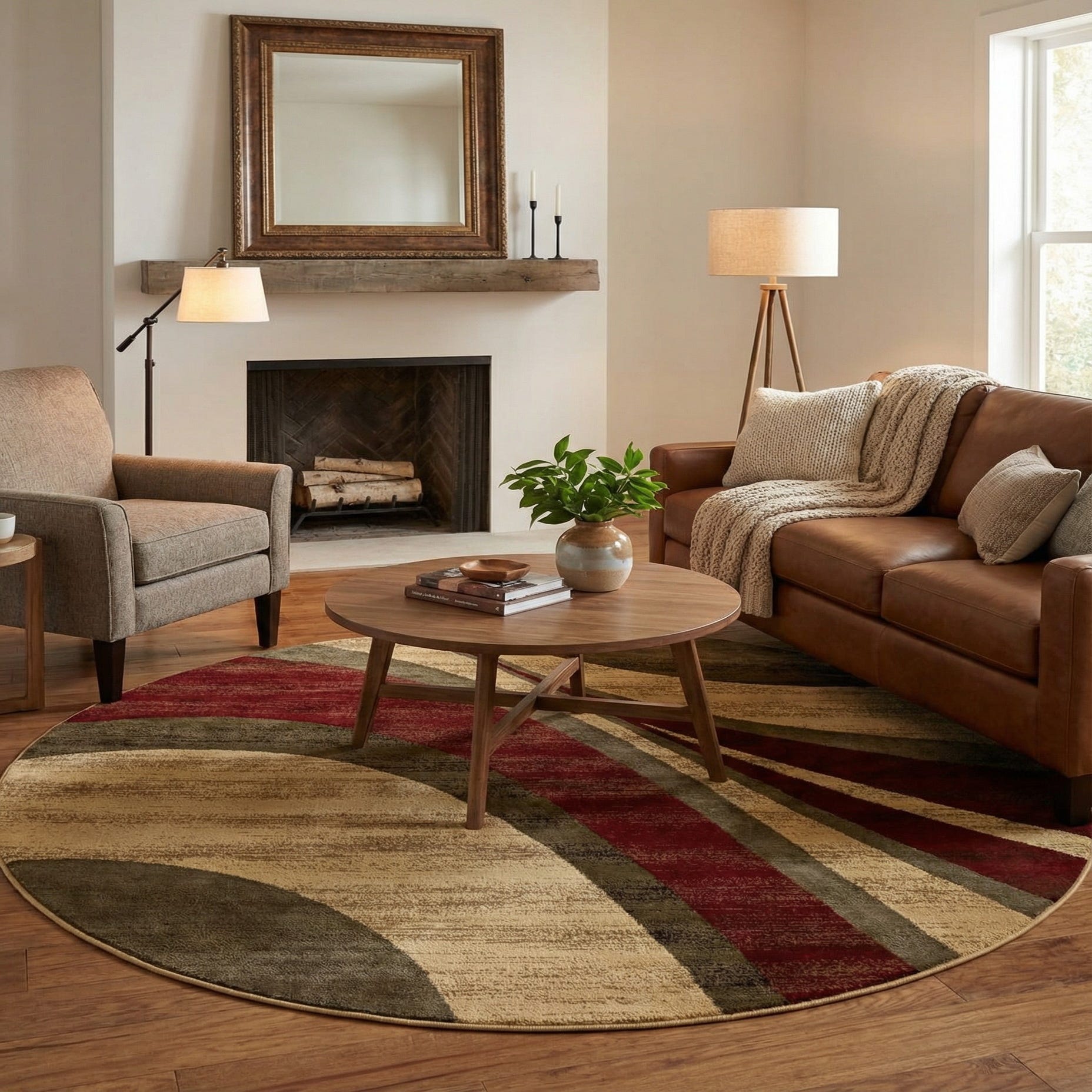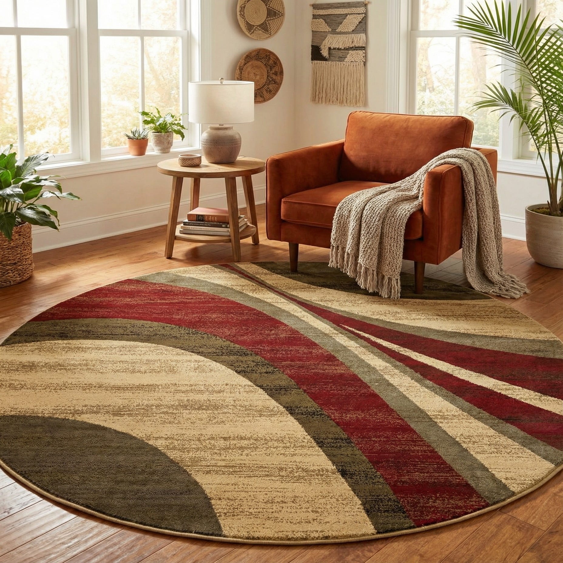 Works well in contemporary and transitional rooms where a round footprint can anchor a seating group or define a dining area. Pair it with warm wood furniture and leather upholstery for a cozy, grounded feel, or use it to add contrast beneath light, neutral sofas and metal-accented pieces in a modern living room or office. The color palette also complements jewel-toned accents and olive or gray textiles for layered, pulled-together interiors.