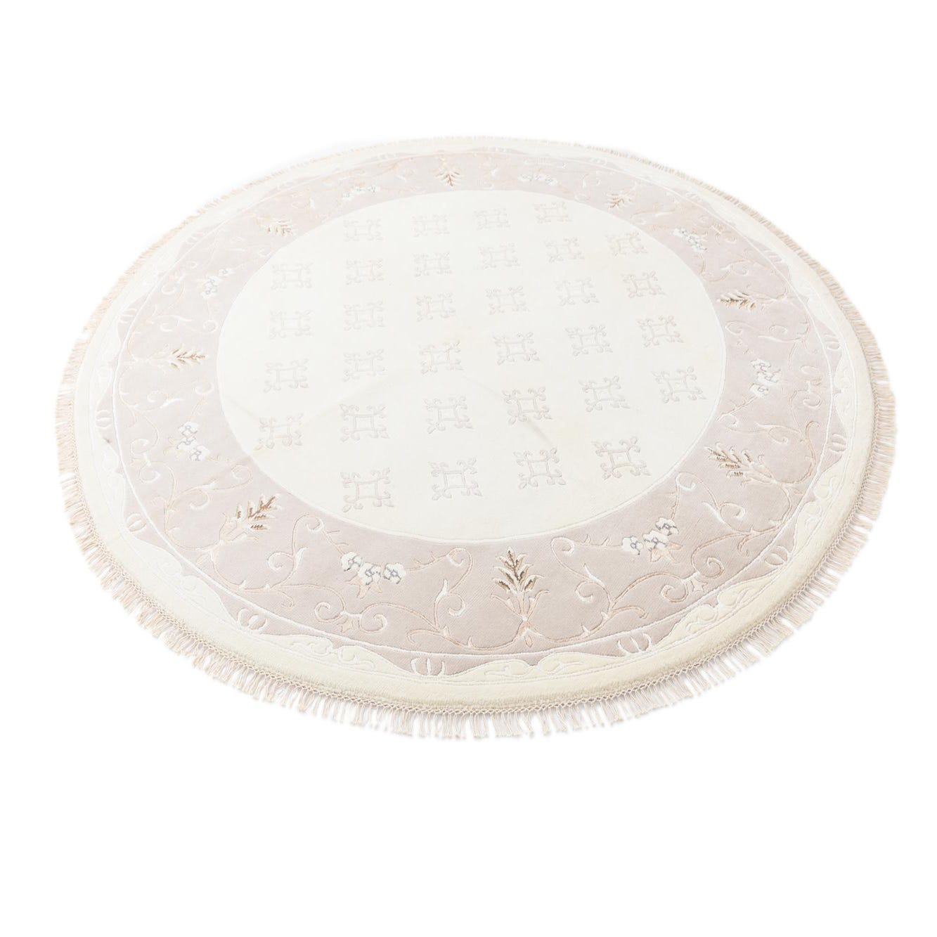 The rug's neutral color palette and timeless design elements make it versatile for various interior design scenarios. It would be particularly well-suited for spaces seeking a touch of traditional charm, such as a classic living room, an upscale office, or a refined bedroom setting. Additionally, the circular shape offers a unique opportunity to soften angular spaces or complement round furniture, like a central coffee table or beneath a chandelier in a dining area.