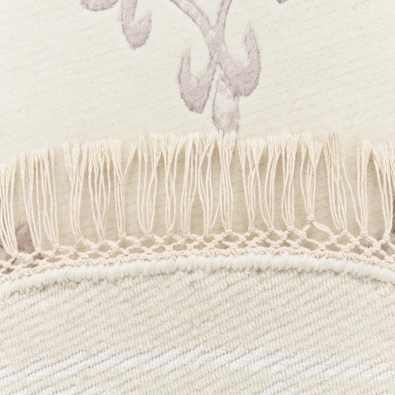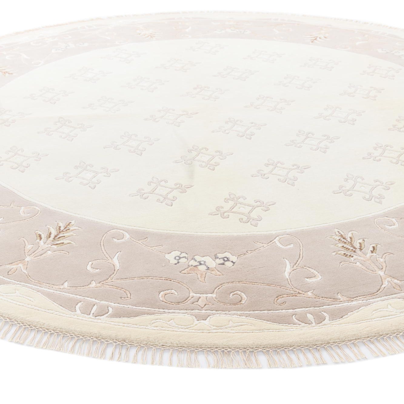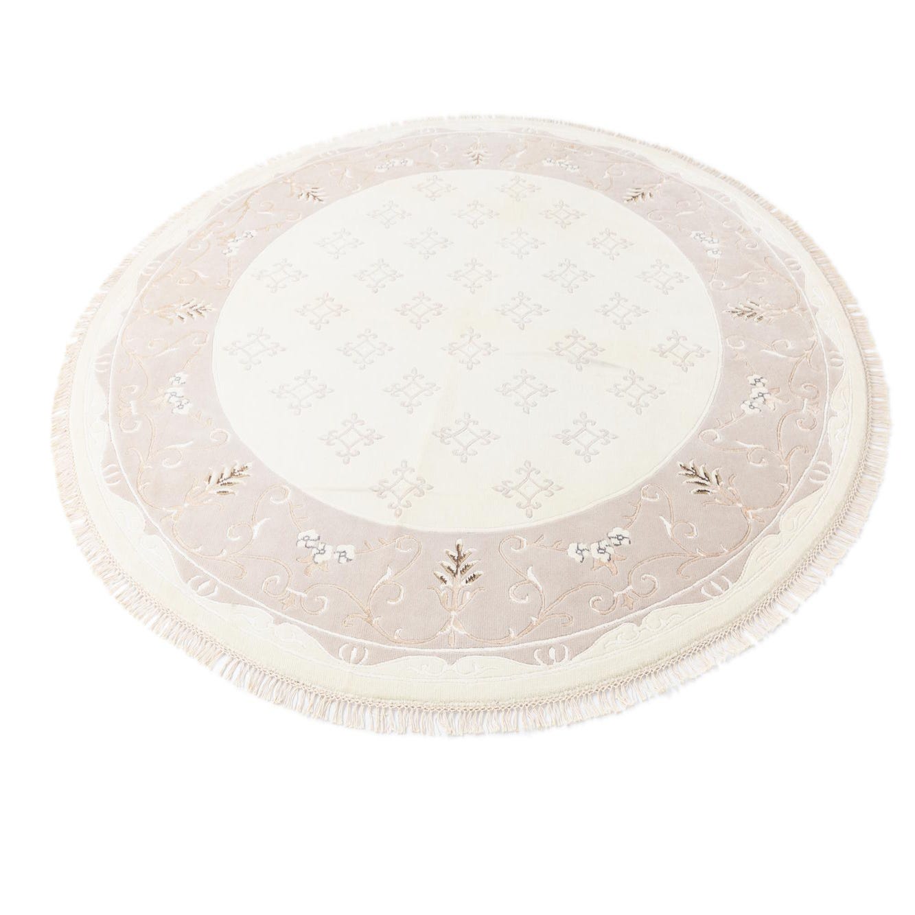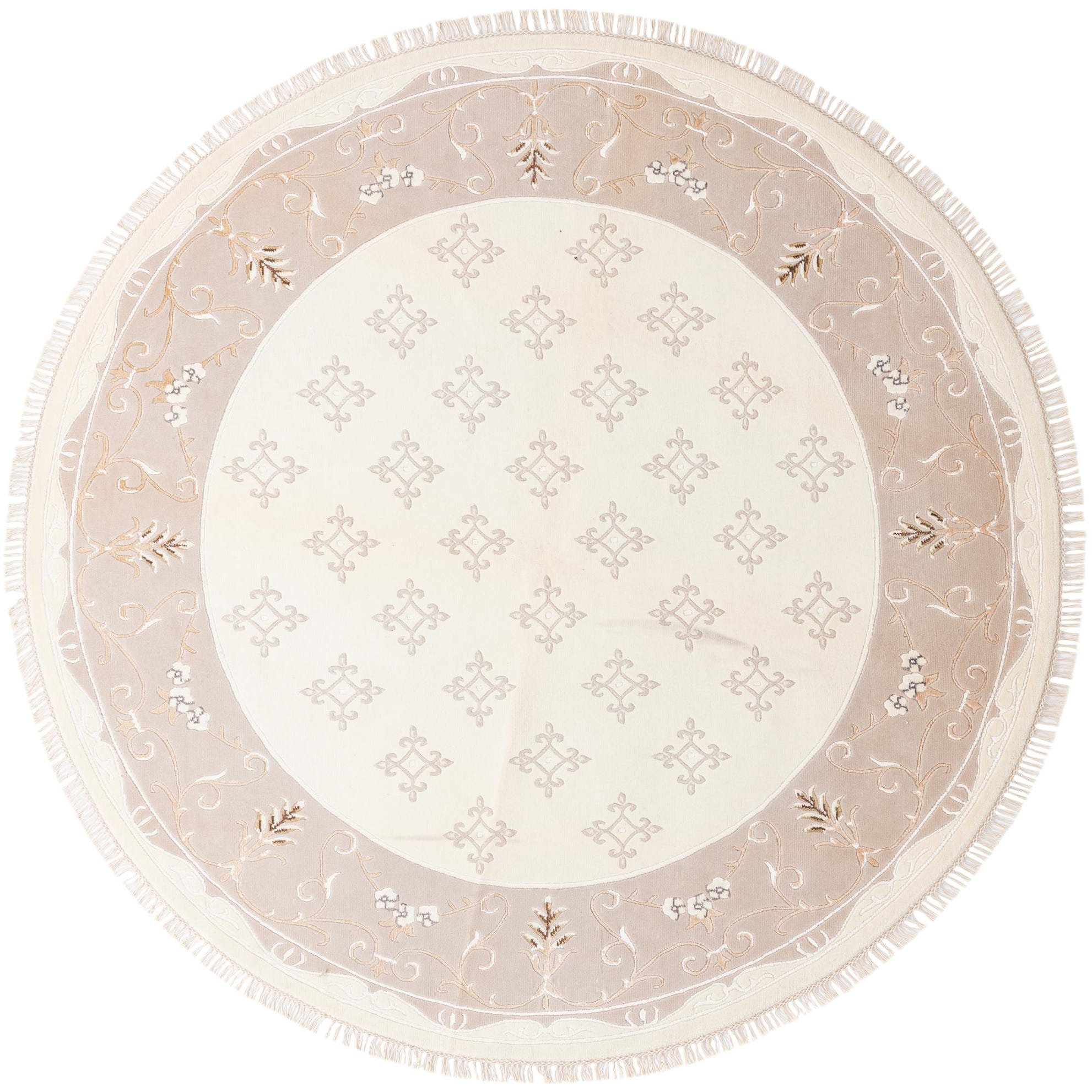 A round, handmade Darya wool rug in 8' 4 x 8' 4 size, featuring a modern oriental pattern with a cream center and a tan border, accented with delicate floral motifs and fringe.