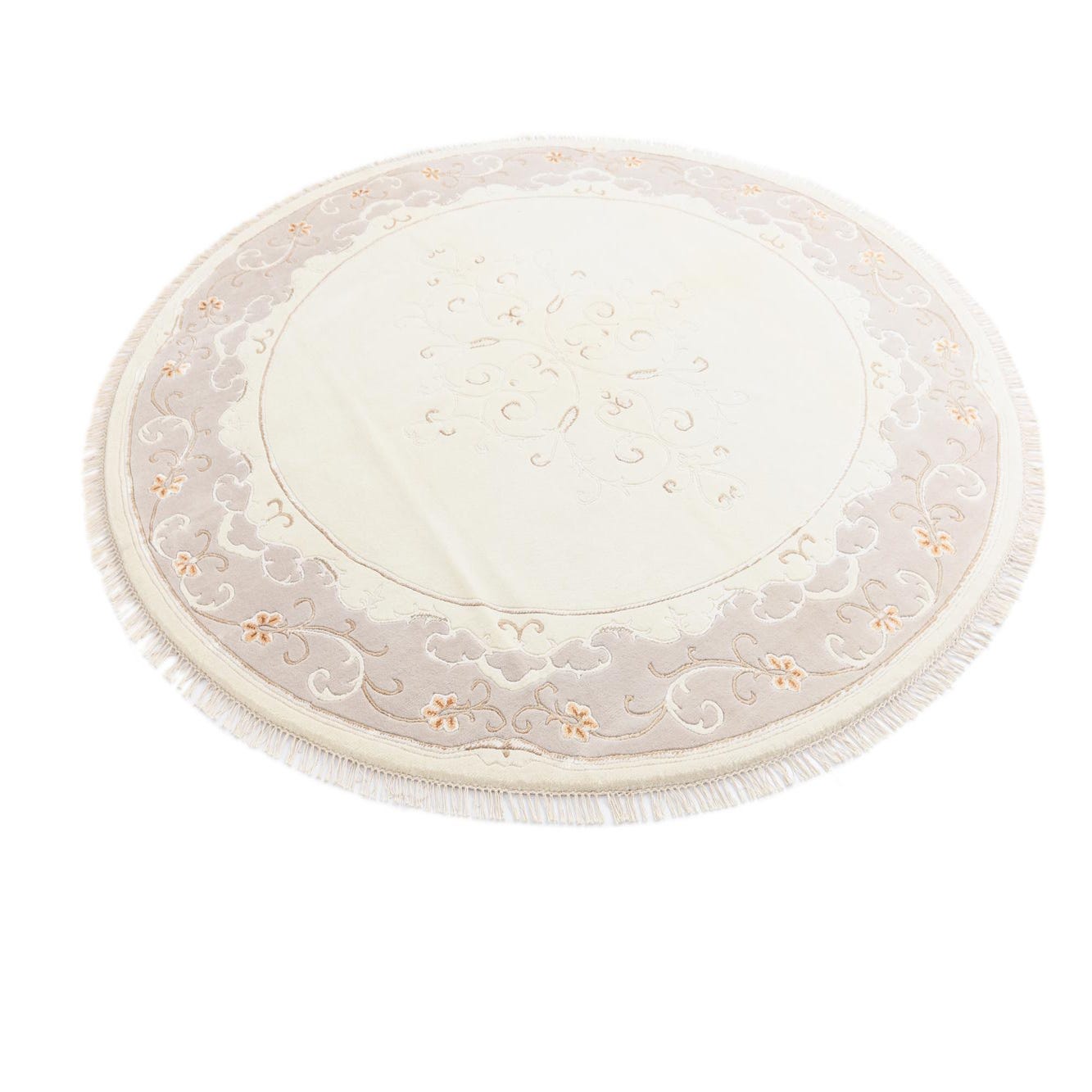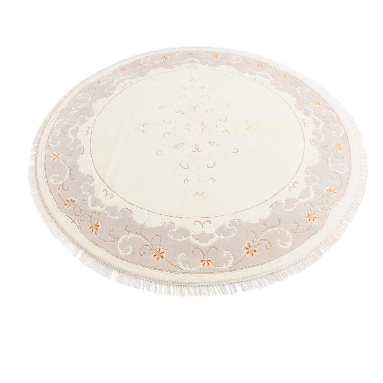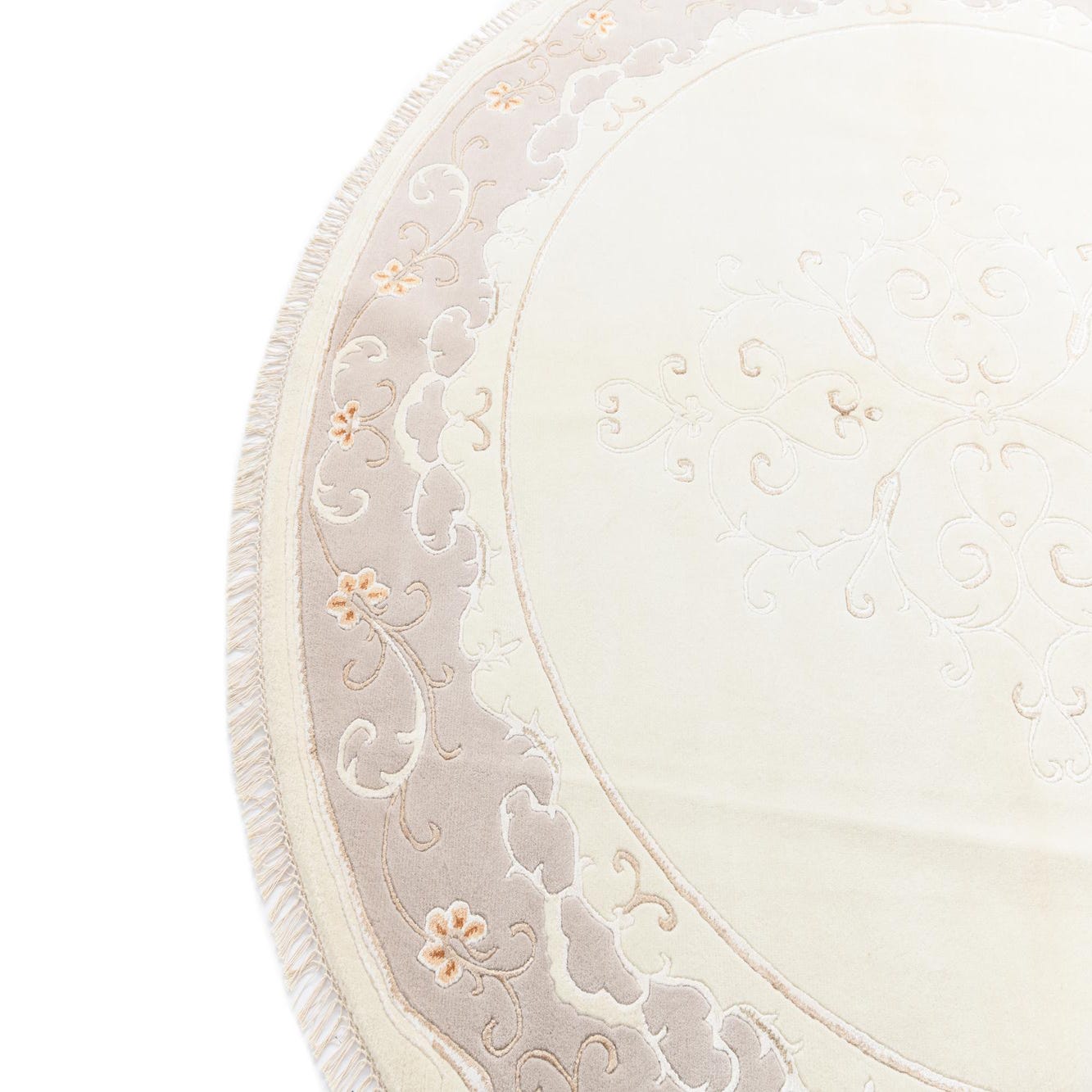 A round Darya rug, 8'3" in diameter, featuring an ivory center with an ornate medallion and a tan border with floral accents.