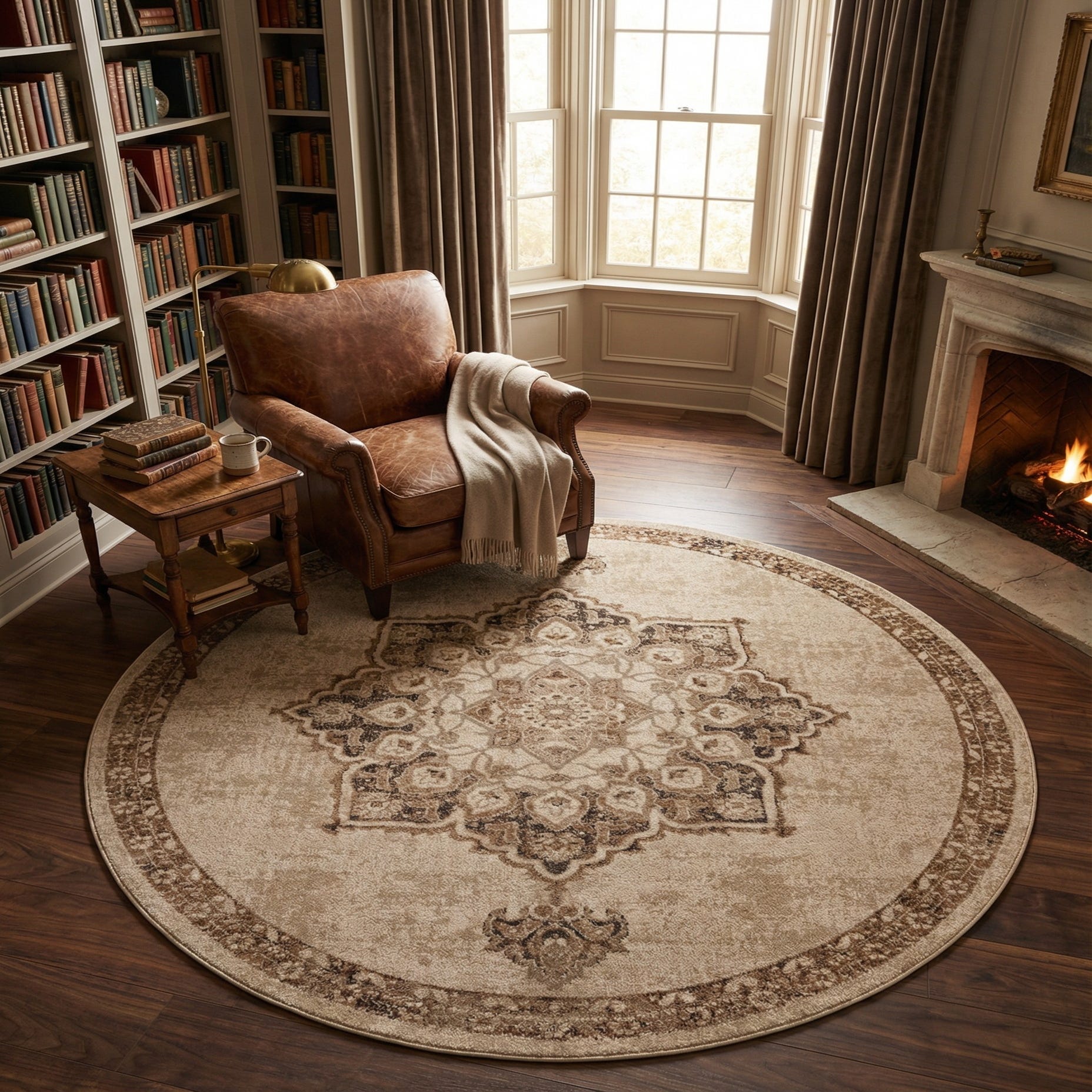 A warm beige field provides a neutral canvas for an ornate central medallion worked in shades of brown, light brown and ivory. Floral and geometric motifs radiate from the center with a softly aged effect, while a narrow, deeper-brown border defines the round silhouette. Machine-made from 100% polypropylene, the rug has a low pile with a soft hand and a subtle sheen that lifts the pattern without adding bulk underfoot.