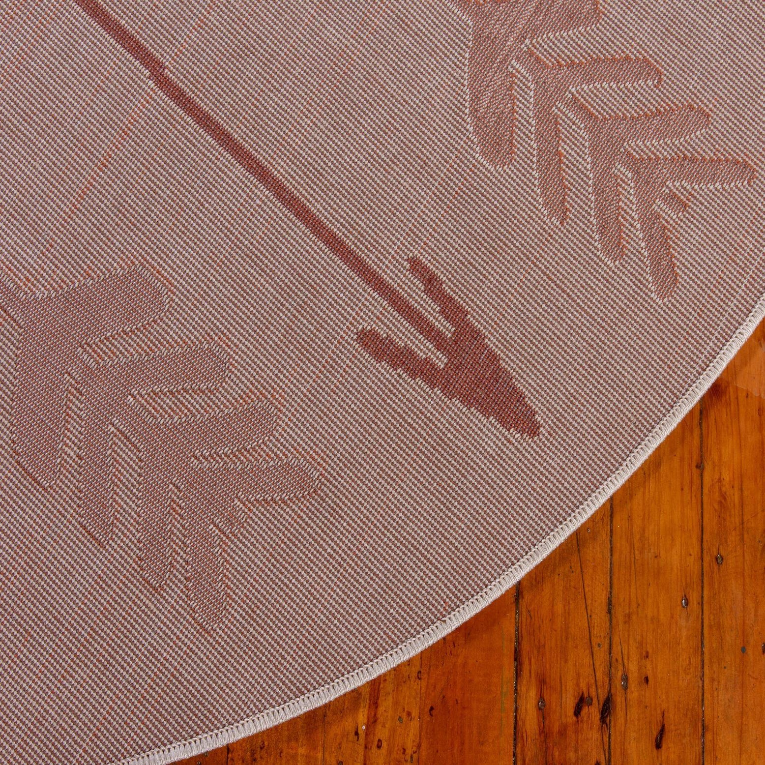 The Equinox Collection offers a contemporary addition to any room with its 8 Ft Round rug, designed to blend seamlessly into a range of interior styles. The rug features a clean beige background, accentuated with a pattern of arrows in complementary shades of brown, burgundy, and terracotta. This thoughtfully curated color palette provides a warm, earthy ambiance, while the arrow motifs add a touch of modernity and directional flow to the design.