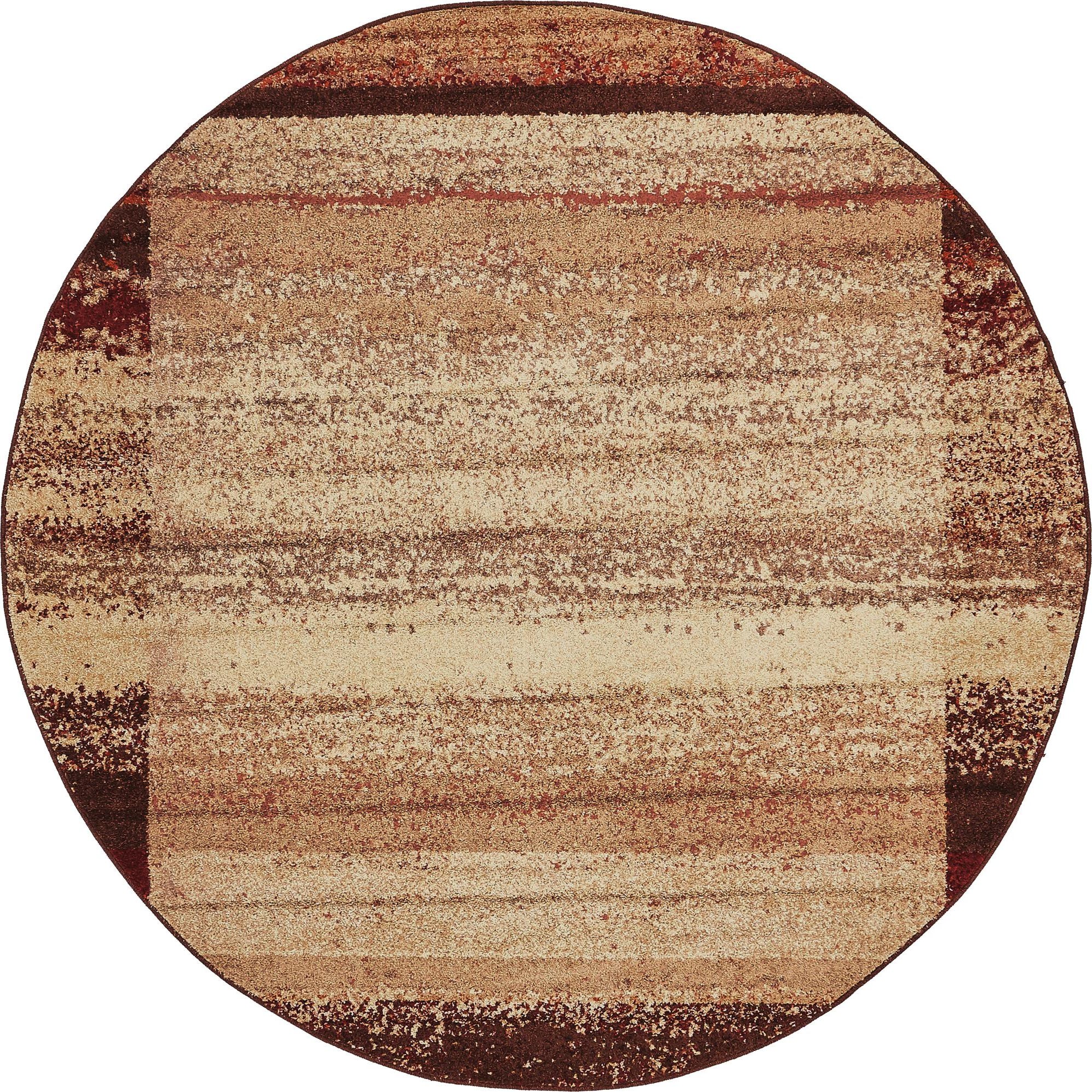A warm, contemporary round rug with a softly distressed pattern of horizontal striations and speckled washes. The beige background provides a neutral base while bands of light brown, terracotta and deeper brown create layered, tonal movement across the surface. Small burgundy accents at the edges punctuate the composition and add visual interest without overpowering the overall palette. The pile feels low-profile and slightly dense to the touch, offering a gentle, cushioned surface underfoot with a subtle, textured finish.