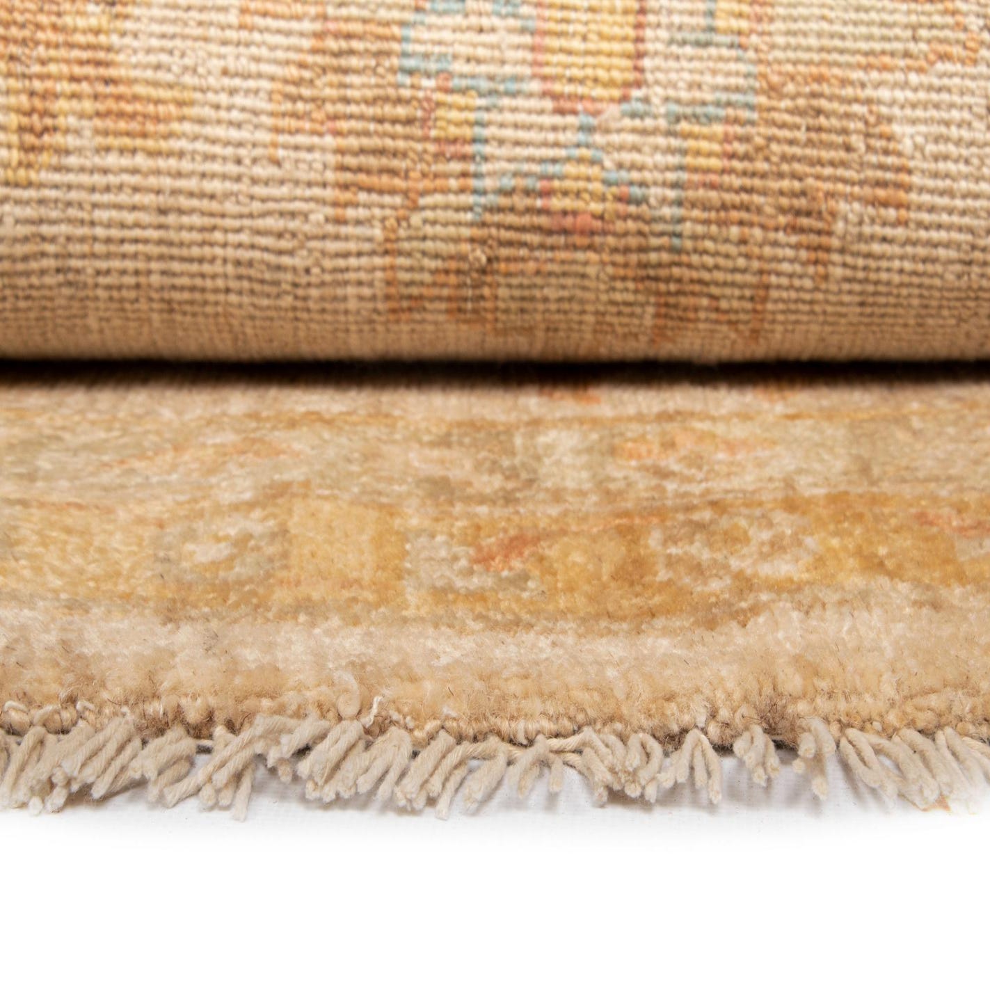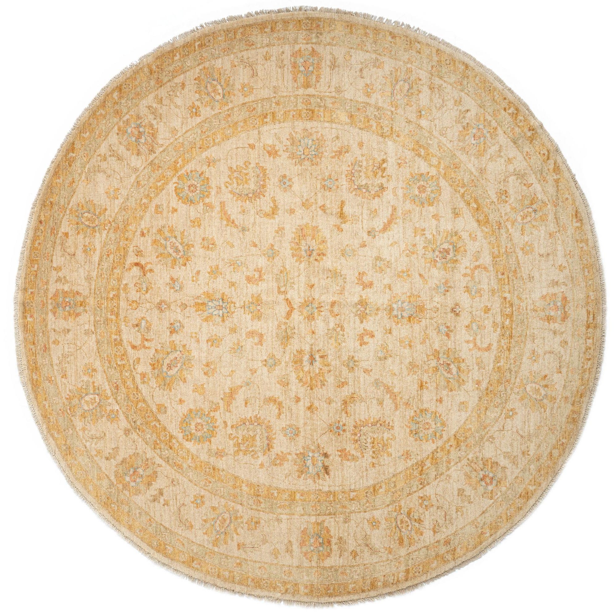 A round, handmade Kaizar Persian rug in warm ivory and tan, featuring an intricate floral medallion pattern and fringed edges.