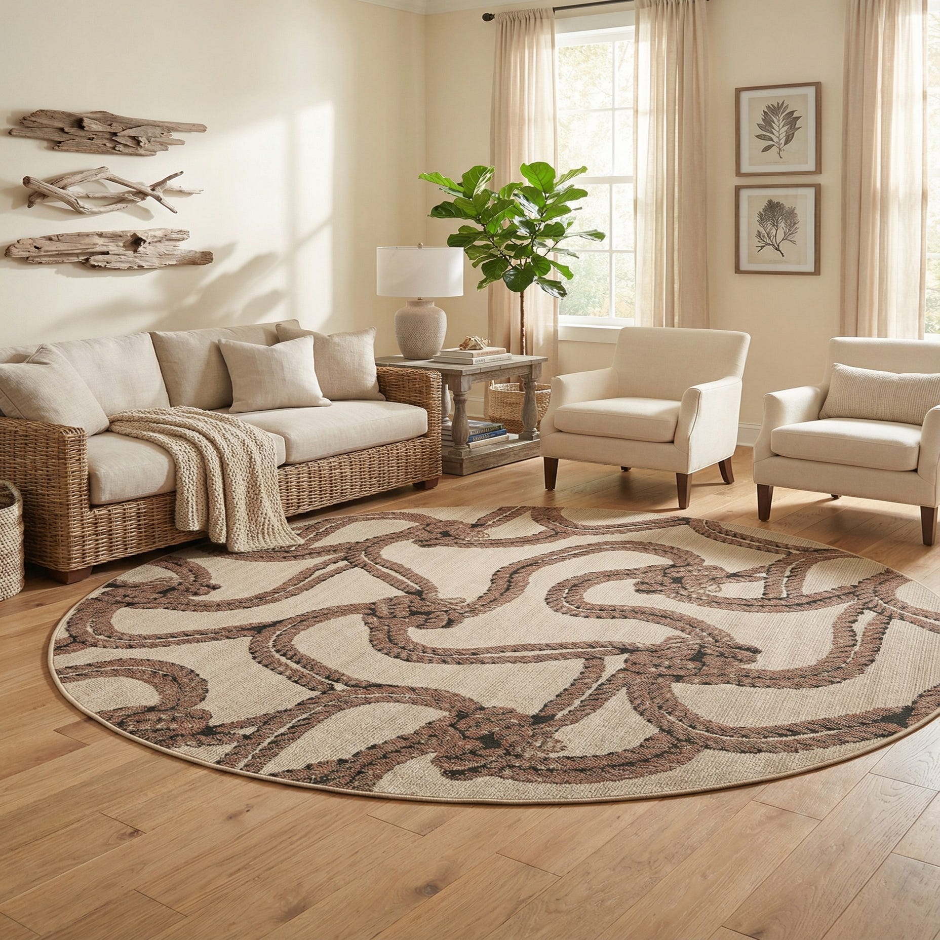 Color accents within the design allow for versatile decor matching. Pair this rug with wood or wicker furniture to enhance the natural outdoor vibe or juxtapose it against modern furnishings for an eclectic touch. Its round shape is particularly well-suited for centering furniture arrangements or accenting areas without corners, like curved balconies or circular lounge spaces.