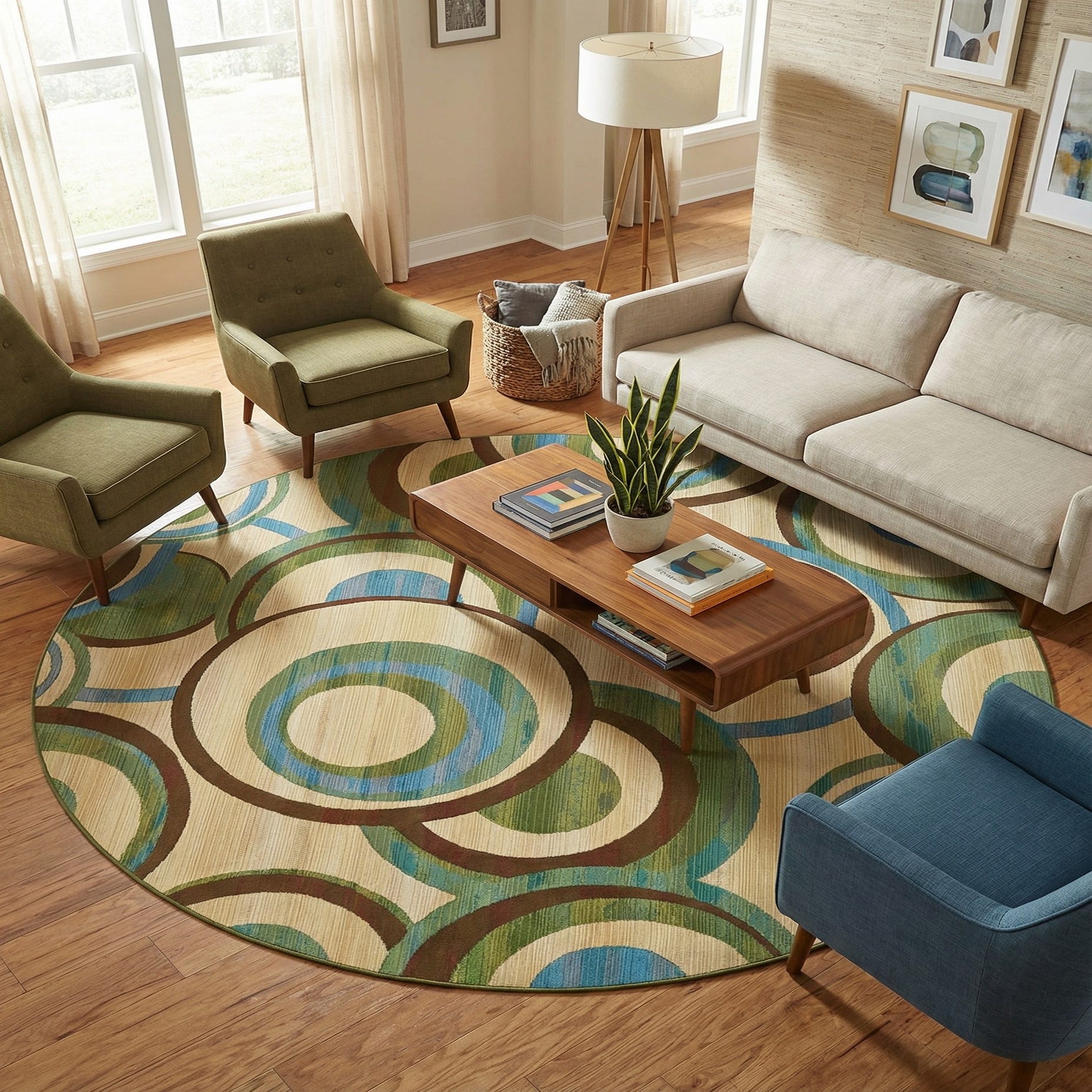 Part of the Outdoor Modern collection, this 8 Ft Round rug is machine woven with 100% polypropylene, ensuring a combination of durability and practicality. The rug features a playful, modern pattern of intertwining circles in a well-balanced palette that includes beige, blue, brown, and green. The beige background allows the other colors to stand out while maintaining a sense of visual harmony.